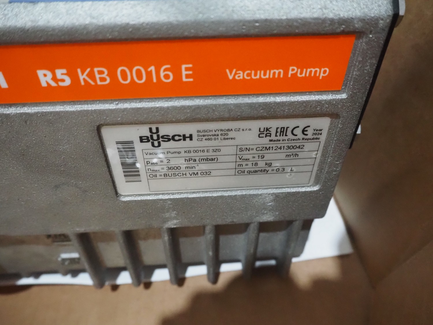 Busch vacuum pump, type: KB 0016 E 3ZO, serial number: CZM124130040, year of construction: 2024, capacity: 19 m³ per hour, dimensions: 290 mm x 220 mm x 200 mm.