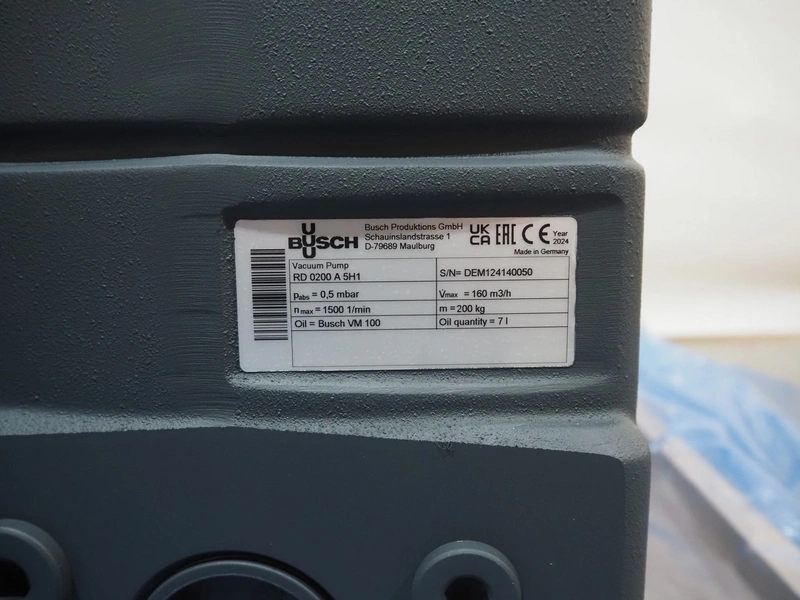 Busch vacuum pump, type: RD 0200 A 5H1, serial number: DEM124140050, year of construction: 2024, capacity: 160 m³ per hour, dimensions: 800 mm x 600 mm x 430 mm.