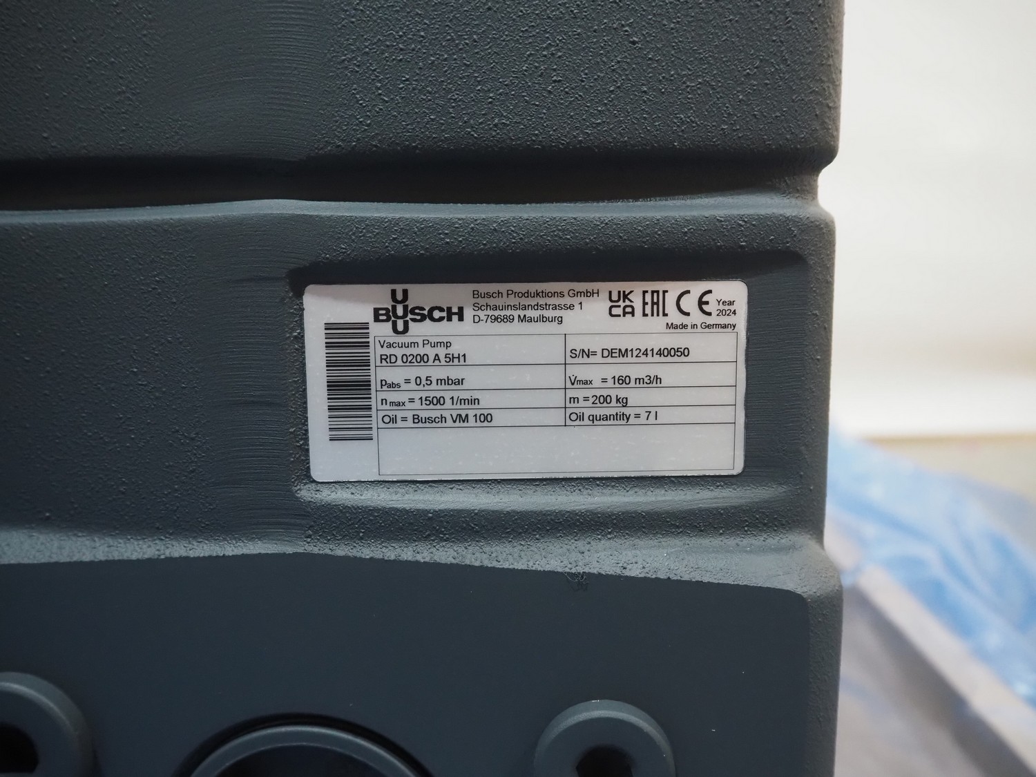 Busch vacuum pump, type: RD 0200 A 5H1, serial number: DEM124140050, year of construction: 2024, capacity: 160 m³ per hour, dimensions: 800 mm x 600 mm x 430 mm.