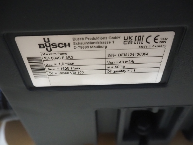 Busch vacuum pump, type: RA 0040 F 5R3, serial number: DEM124430384, year of construction: 2024, capacity: 40 m³ per hour, dimensions: 620 mm x 270 mm x 260 mm.