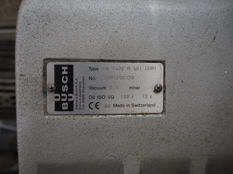 Busch vacuum pump, type: RA 0400 B 461 DUBI, number: C9937000579, capacity: 400 m³ per hour, dimensions: 1300 mm x 850 mm x 1400 mm.