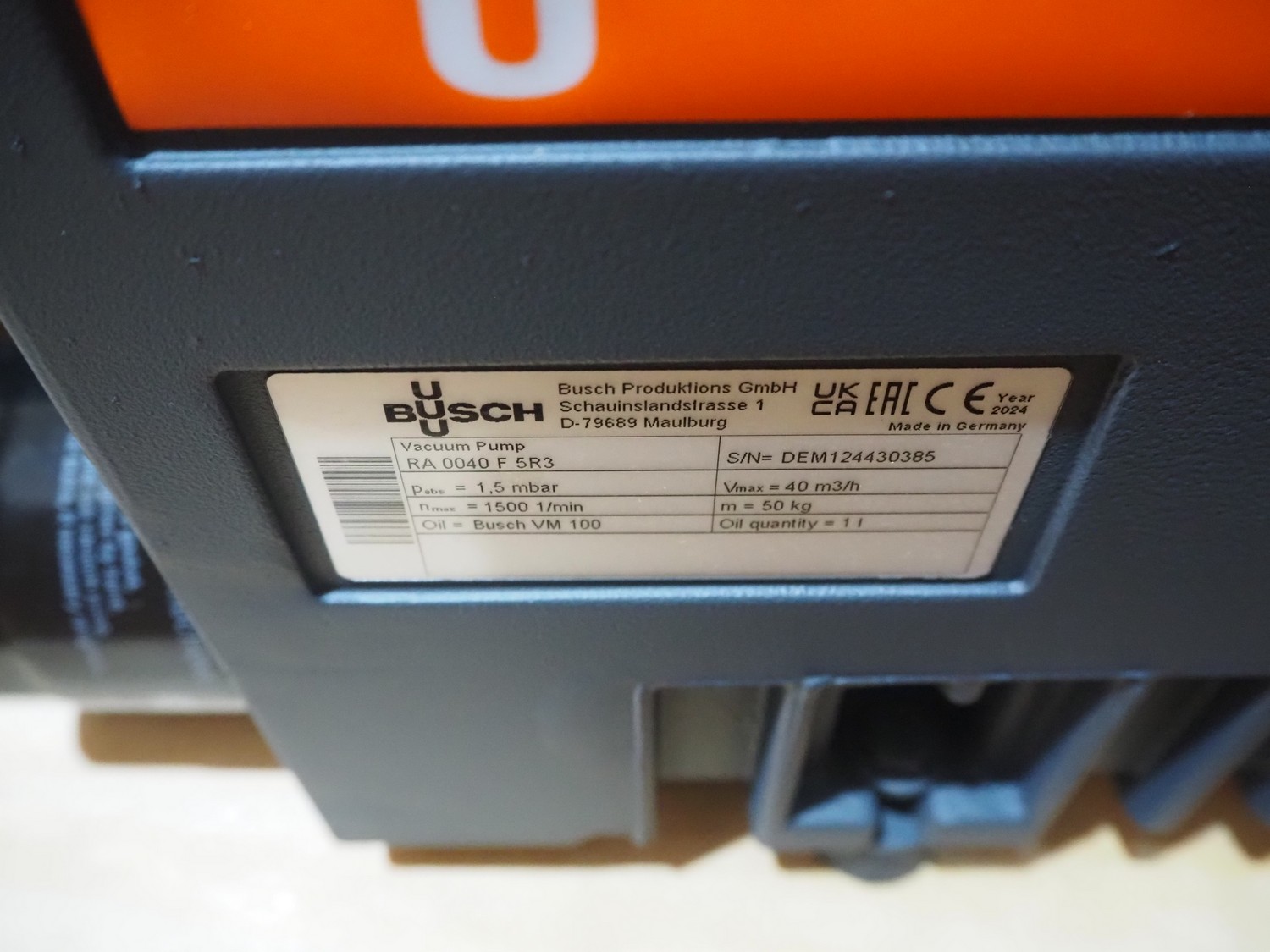 Busch vacuum pump, type: RA 0040 F 5R3, serial number: DEM124430385, year of construction: 2024, capacity: 40 m³ per hour, dimensions: 620 mm x 270 mm x 260 mm.