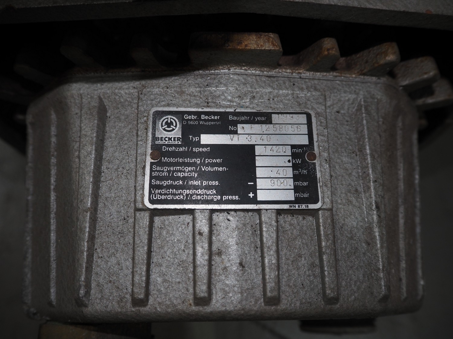 Becker vacuum pump, type: VT 3.40, number: F 1258056, year of construction: 2013, capacity: 40 m³ per hour, dimensions: 500 mm x 230 mm x 360 mm.
