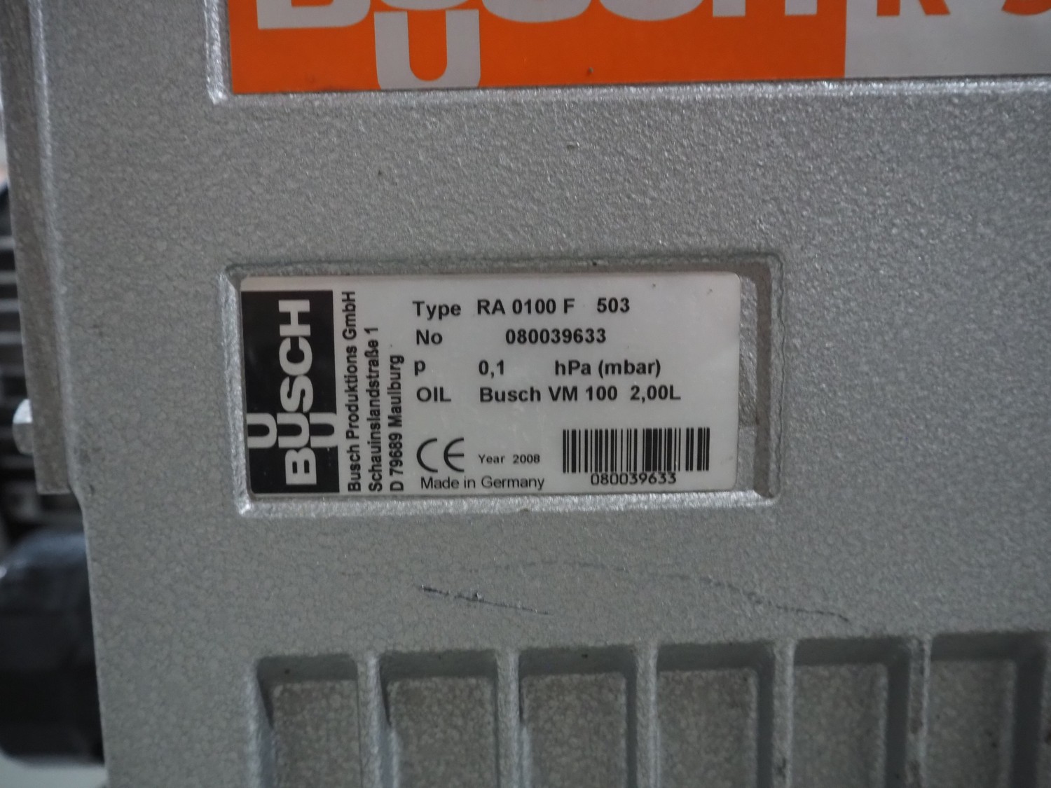 Busch vacuum pump, type: RA 0100 F 503, serial number: 080039633, year of construction: 2008, capacity: 0.1 mbar, dimensions: 700 mm x 400 mm x 700 mm.