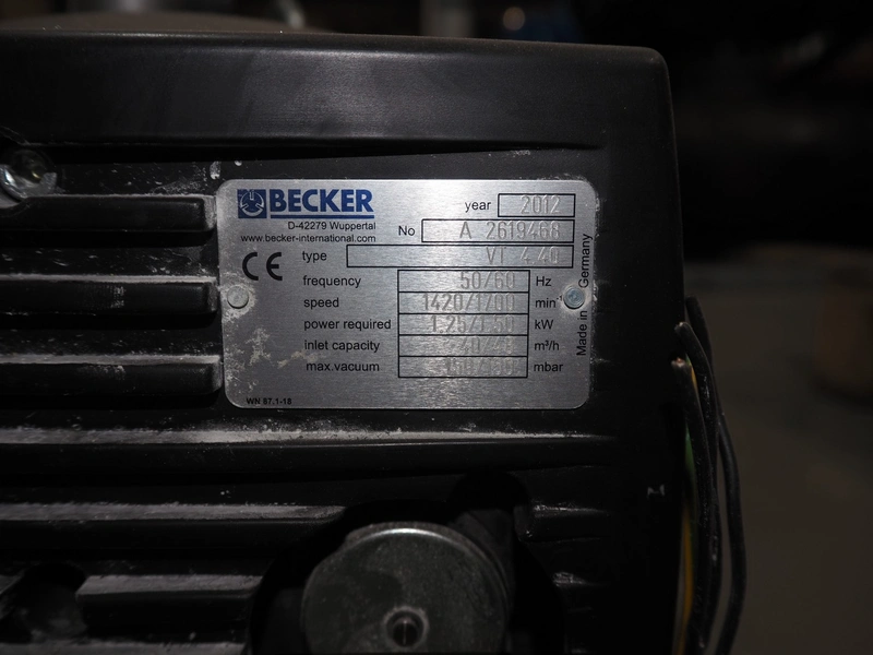 Becker vacuum pump, type: VT 4.40, number: A 2619468, year of construction: 2012, 50/60 Hz, capacity: 40/48 m³ per hour, dimensions: 570 mm x 270 mm x 300 mm.