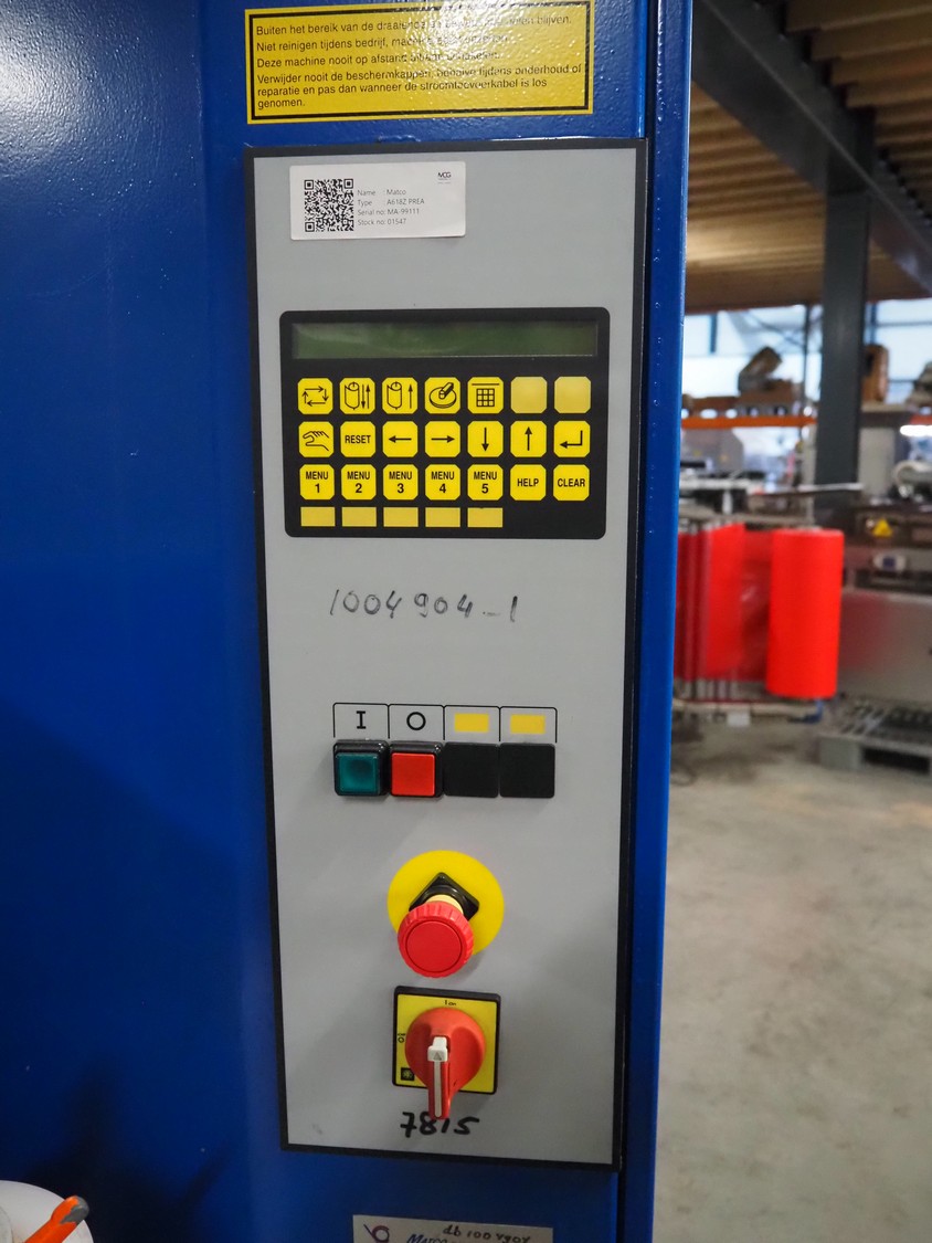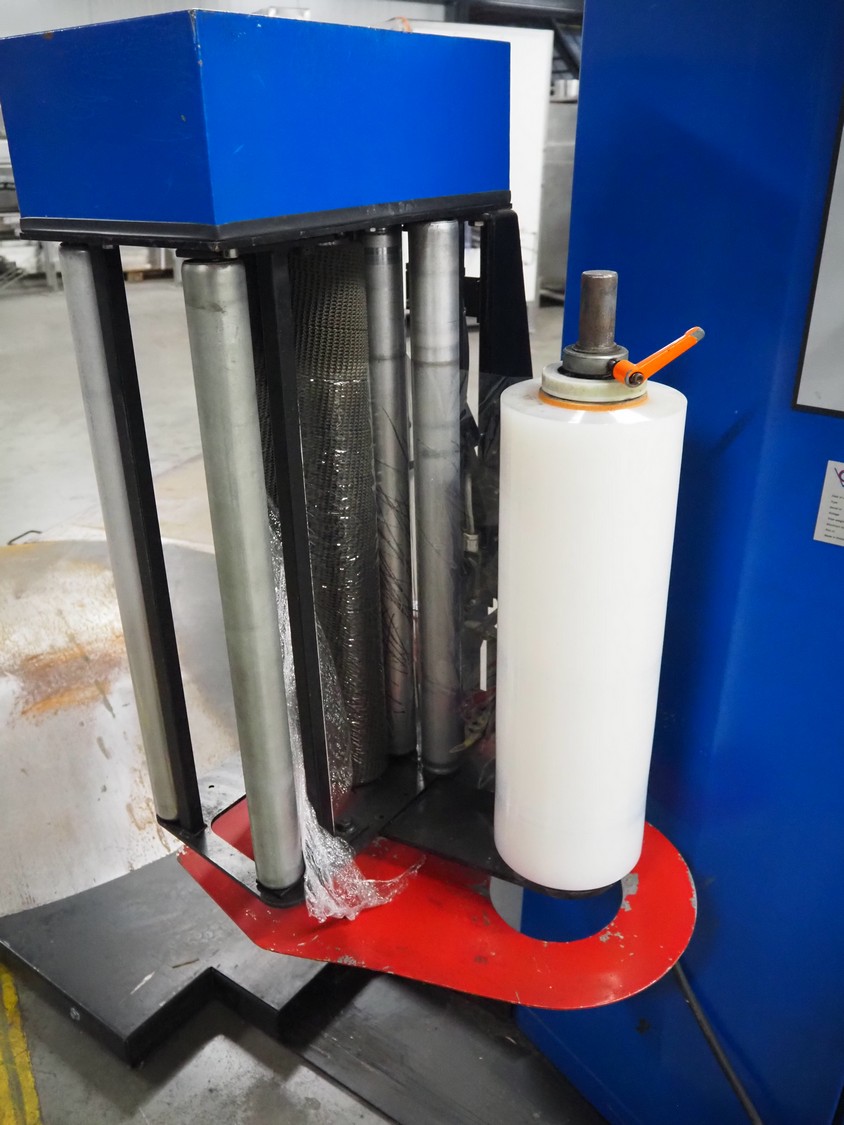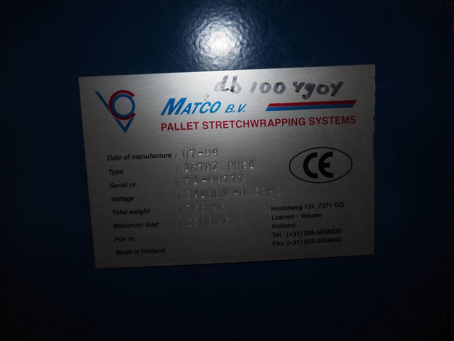 Matco pallet wrapper, type: A618Z PREA, serial number: MA-99111, year of construction: 01/1999, 400 V, 3 Ph, 50 Hz, 765 kg, steel platform, diameter platform: 1750 mm, total dimensions: 3000 mm x 1750 mm x 2600 mm.