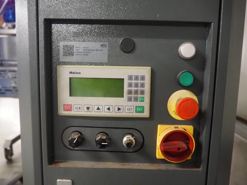 Meiwa pallet wrapper, type: WP1 EVC, serial number: E0701347, year of construction: 11/2007, 220 V, 60 Hz, 1000 W, steel platform, diameter platform: 1650 mm, total dimensions: 2650 mm x 1650 mm x 2820 mm.