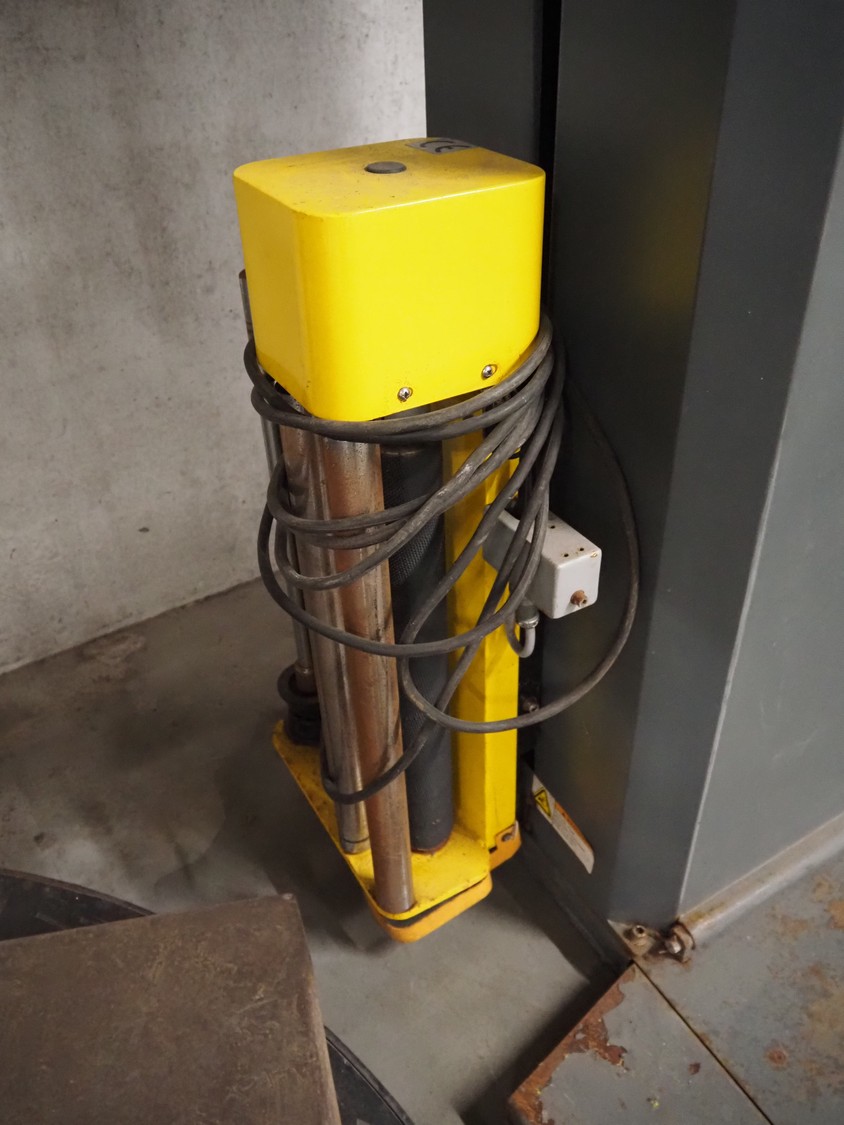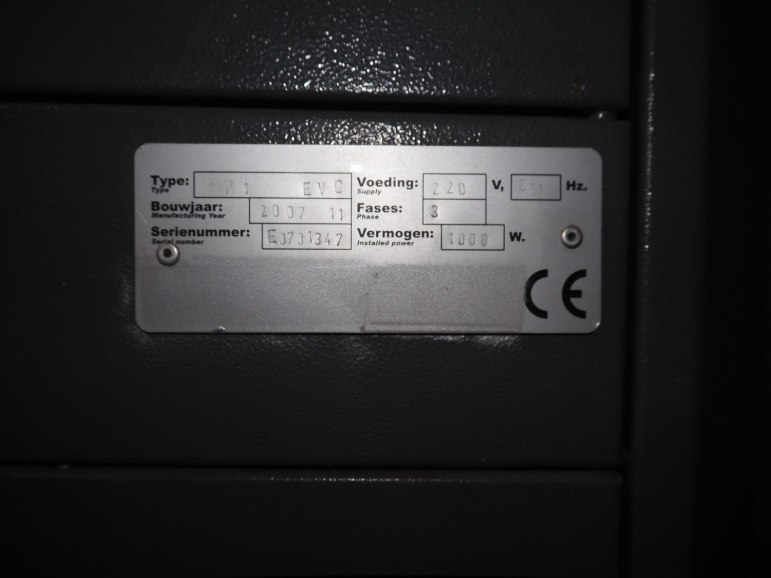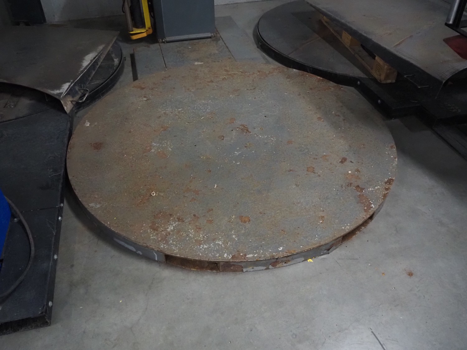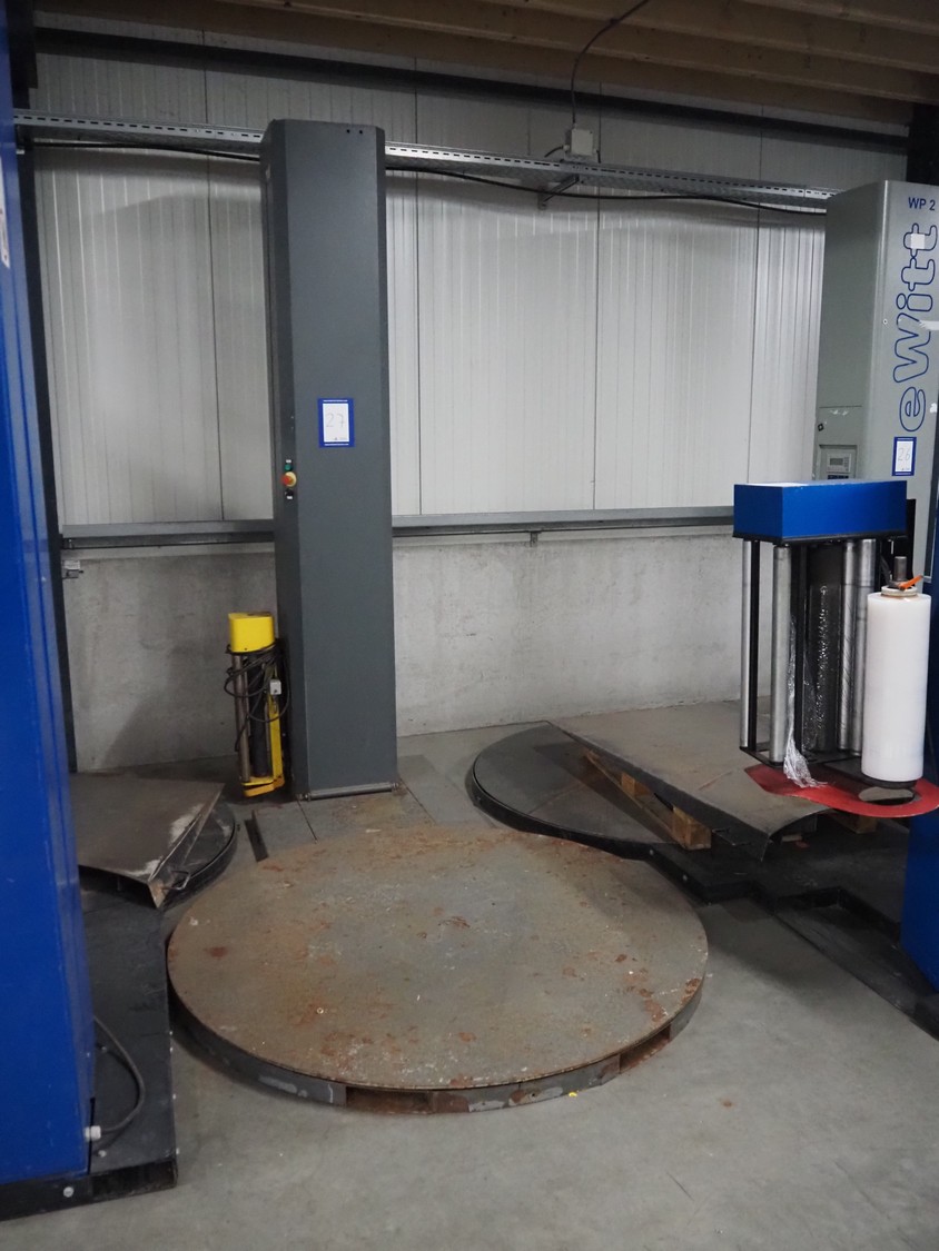Meiwa pallet wrapper, type: WP1 EVC, serial number: E0701347, year of construction: 11/2007, 220 V, 60 Hz, 1000 W, steel platform, diameter platform: 1650 mm, total dimensions: 2650 mm x 1650 mm x 2820 mm.