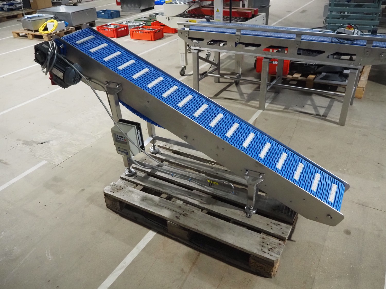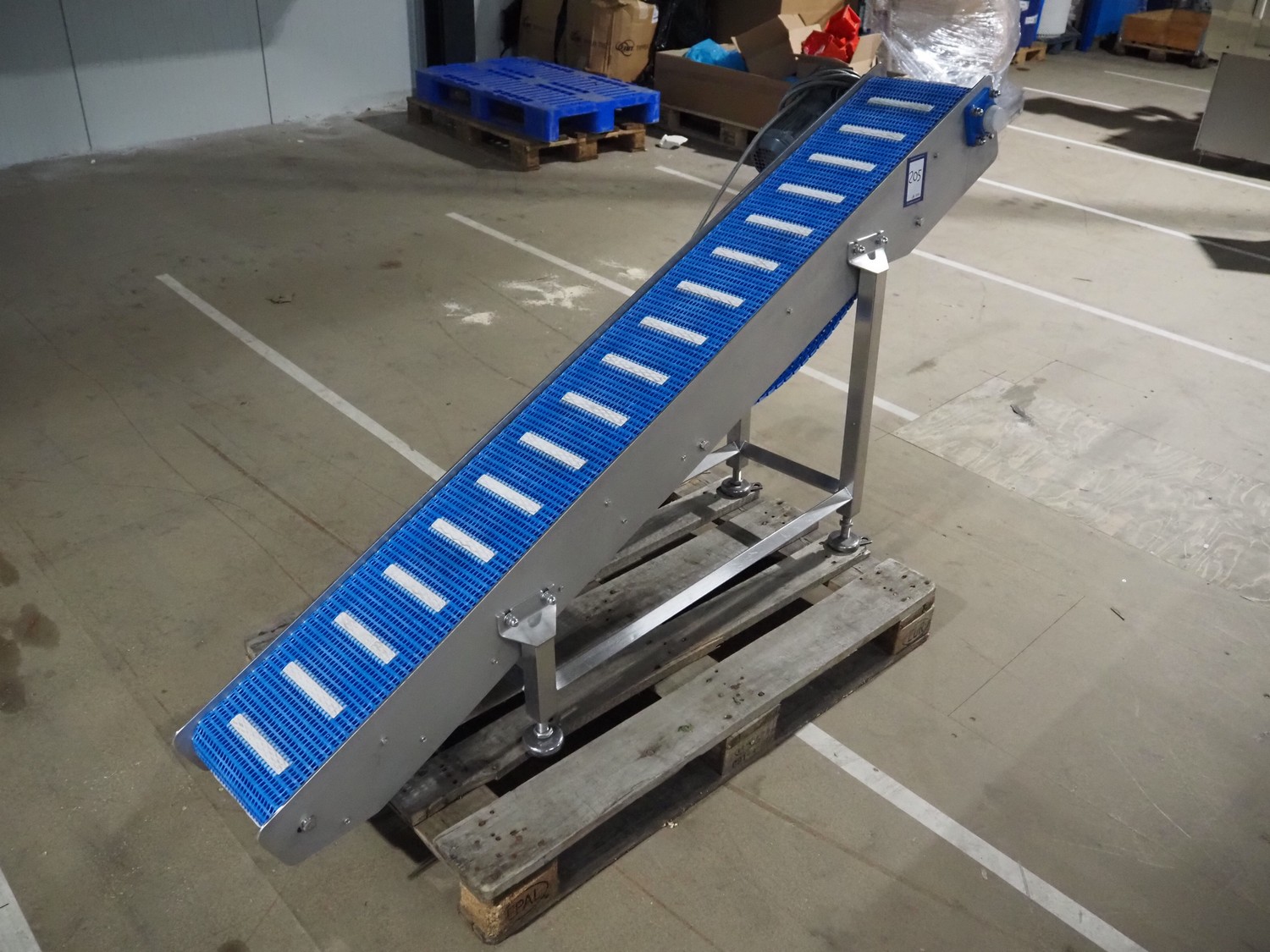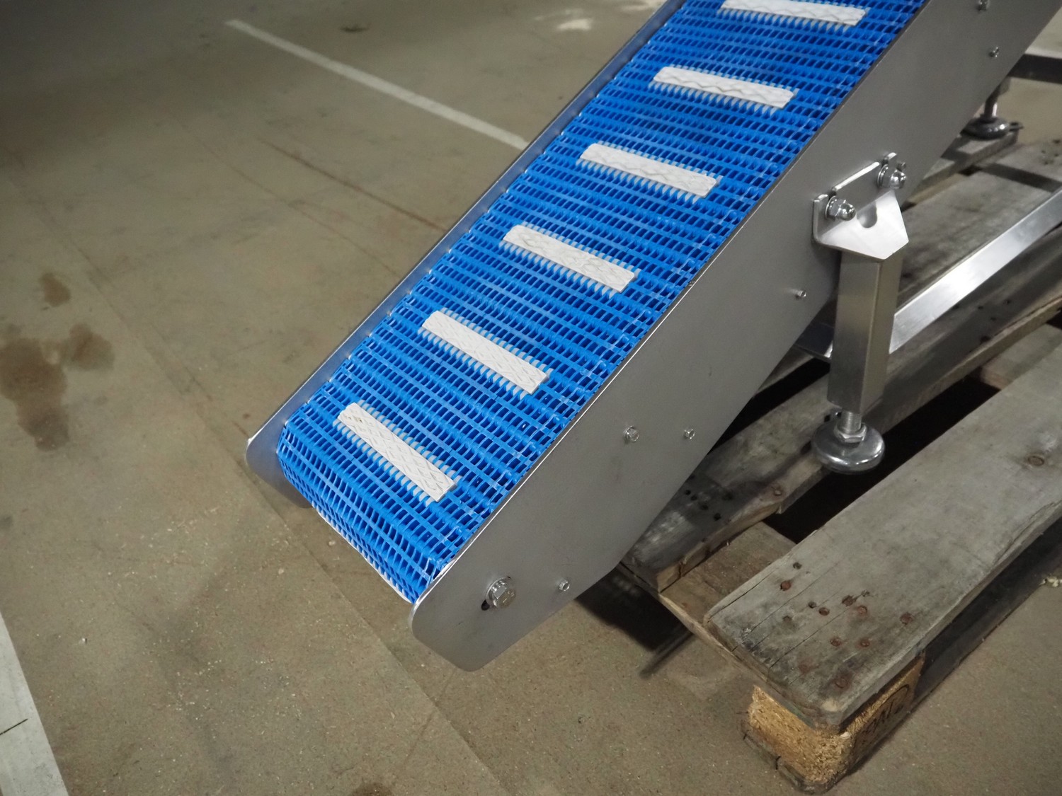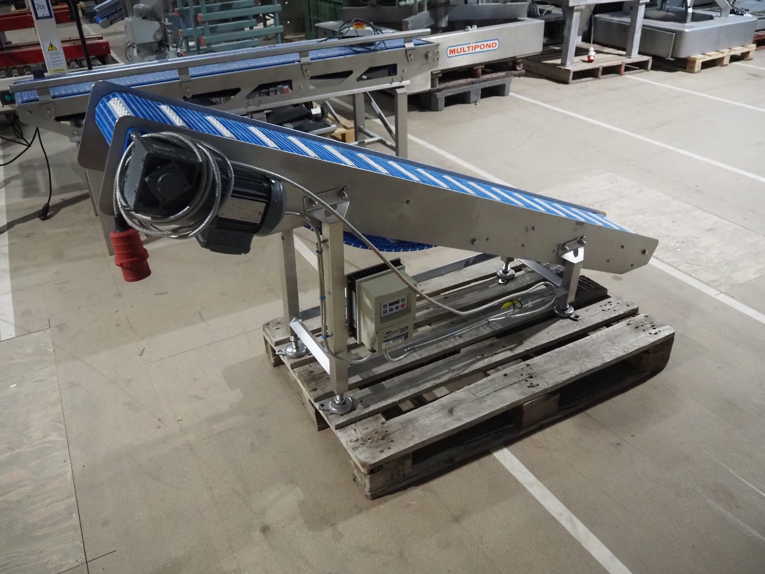 Elevating belt, s/s frame, plastic belt, belt width: 250 mm, elevating height: 950 mm, total dimensions: 1900 mm x 500 mm x 1000 mm.