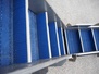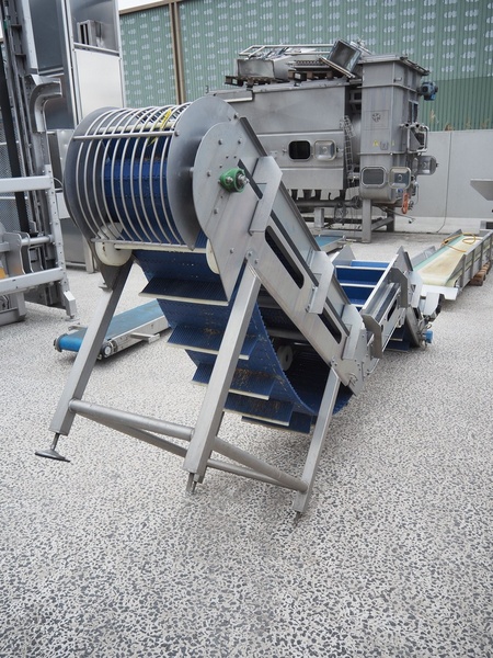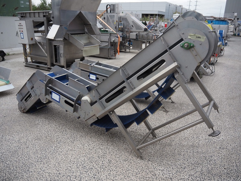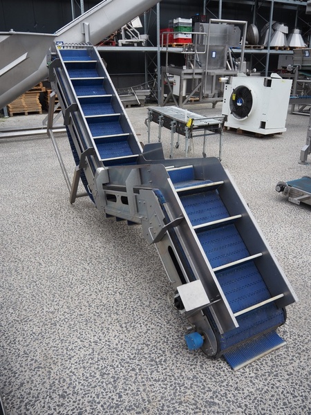 New Motion B.V. elevating belt, type: Elevatorbandtransporteur, plastic belt with dividers, belt width: 460 mm, divider height: 100 mm, distance between dividers: 250 mm, elevating height: 2100 mm, total dimensions: 3600 mm x 650 mm x 1750 mm.