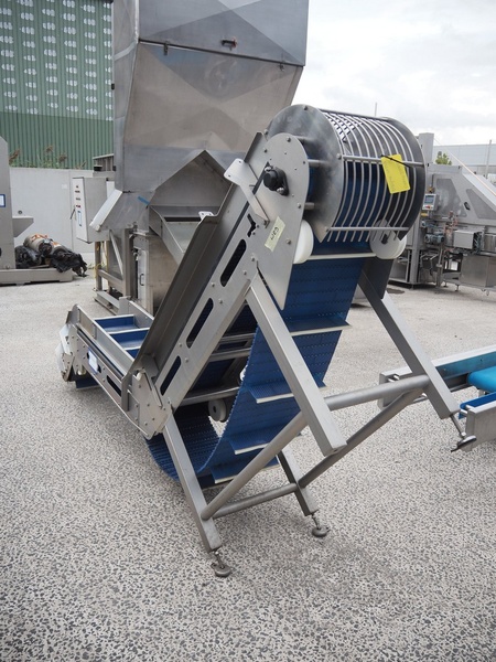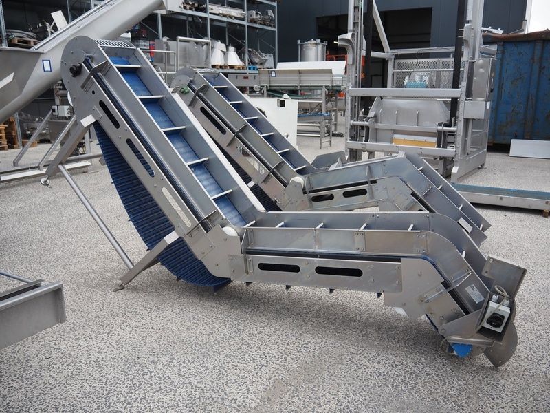 New Motion B.V. elevating belt, type: Elevatorbandtransporteur, serial number: 12014-09-000, year of construction: 2012, plastic belt with dividers, belt width: 460 mm, divider height: 100 mm, distance between dividers: 250 mm, elevating height: 2100 mm, total dimensions: 3600 mm x 650 mm x 1750 mm.