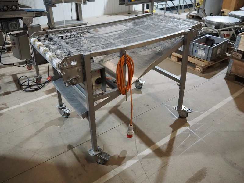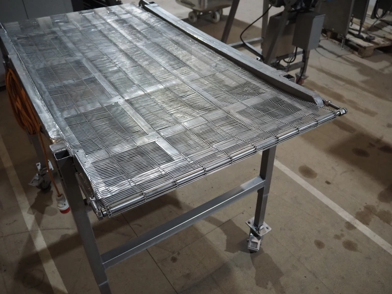 Mobile mesh belt, s/s frame, belt width: 700 mm, total dimensions: 1450 mm x 880 mm x 950 mm.
