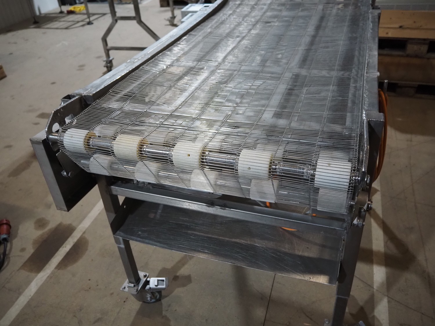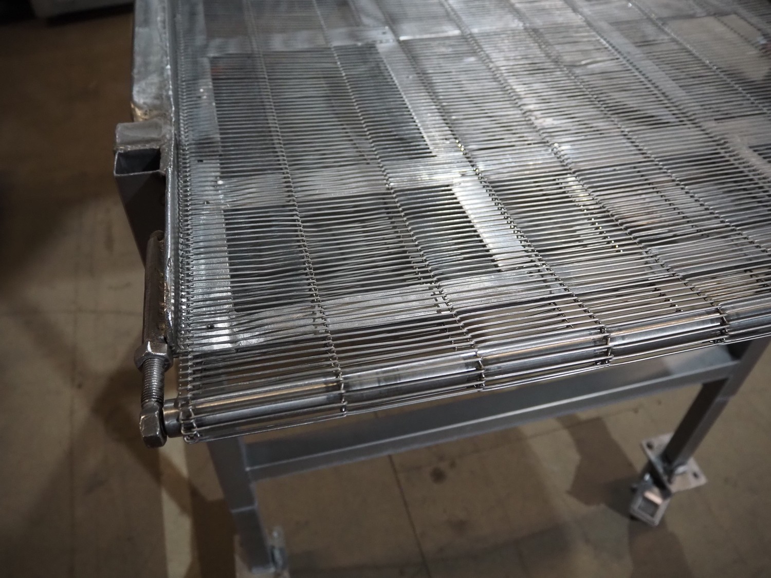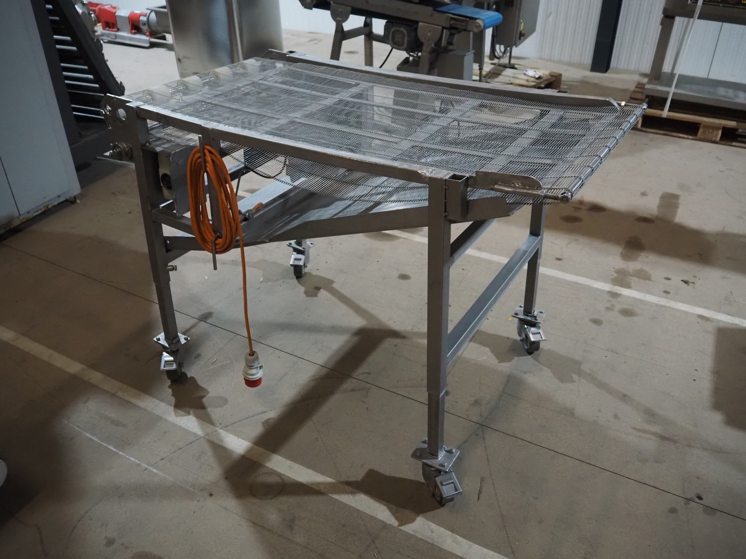 Mobile mesh belt, s/s frame, belt width: 700 mm, total dimensions: 1450 mm x 880 mm x 950 mm.