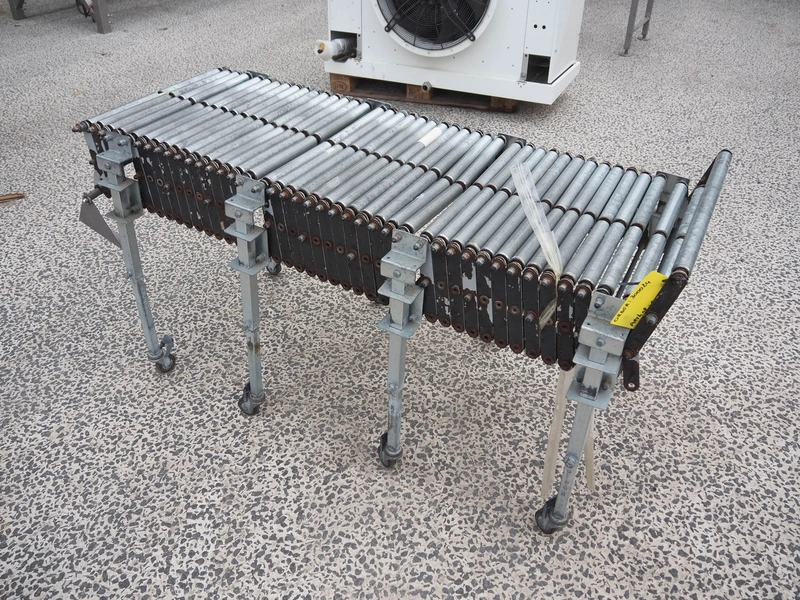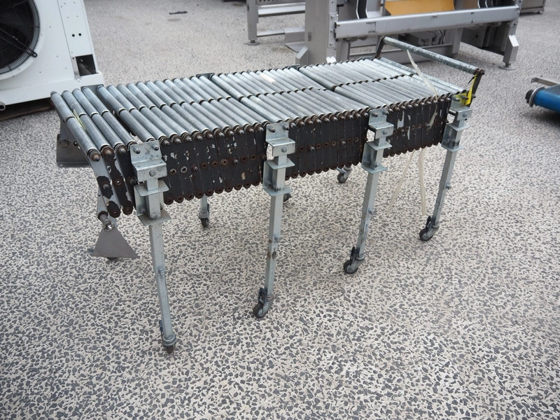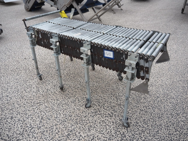 Mobile extendable roller conveyor, s/s frame, s/s rollers, total conveyor width: 500 mm, total dimensions: 1550 mm x 680 mm x 800 mm.