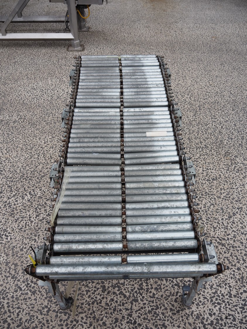 Mobile extendable roller conveyor, s/s frame, s/s rollers, total conveyor width: 500 mm, total dimensions: 1550 mm x 680 mm x 800 mm.