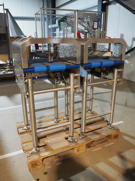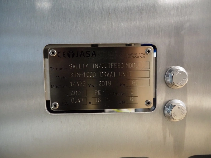 2 Jasa Packaging Solutions product turning conveyors, model: SIM-1000 DRAAI UNIT, year of construction: 2019, 400 V, 3 Ph, 0.47 kW, 16 A, 6 bar, weight: (2x) 60 kg, belt width: (2x) 150 mm and 100 mm, total dimensions: (2x) 600 mm x 550 mm x 1150 mm.