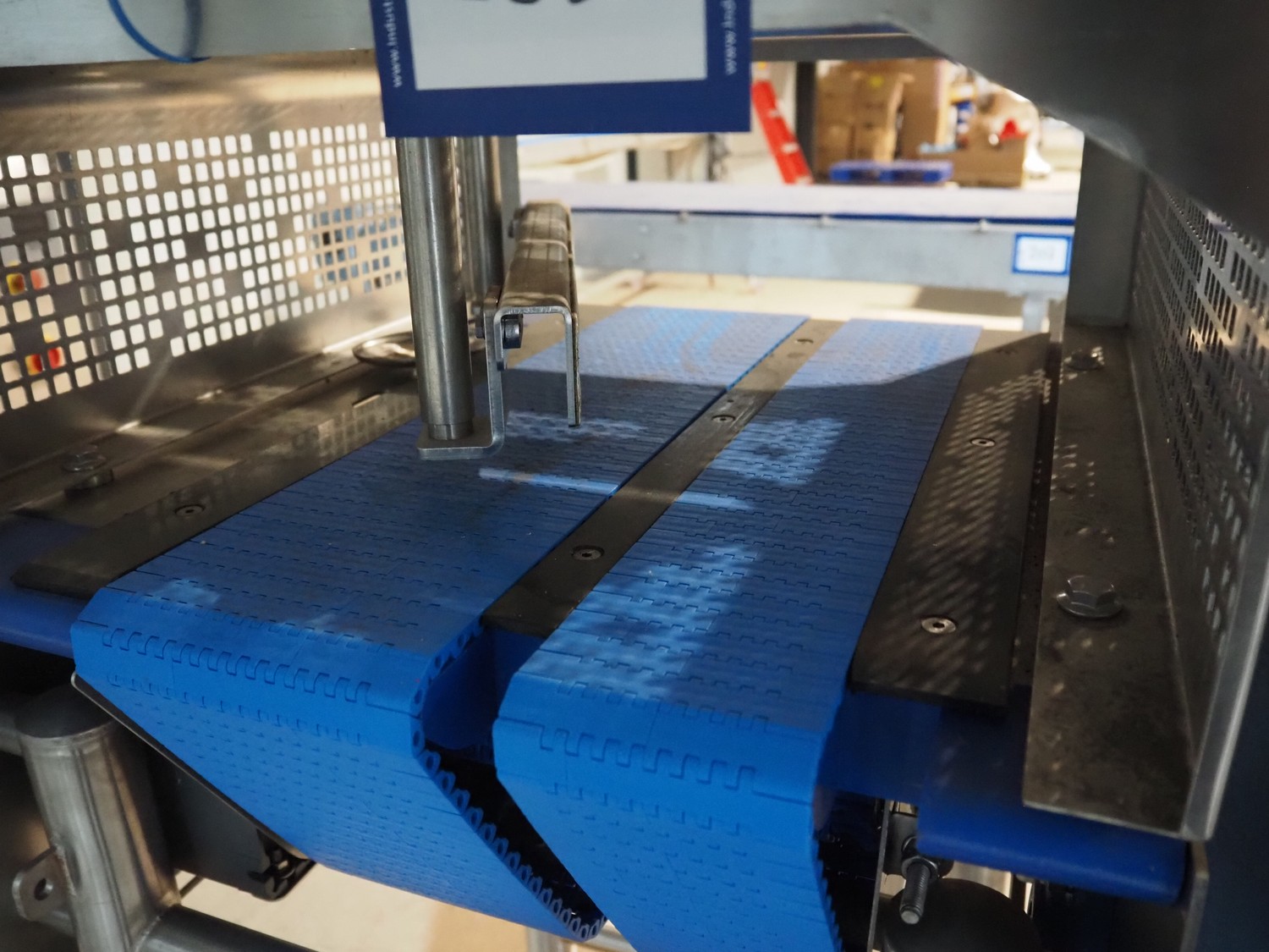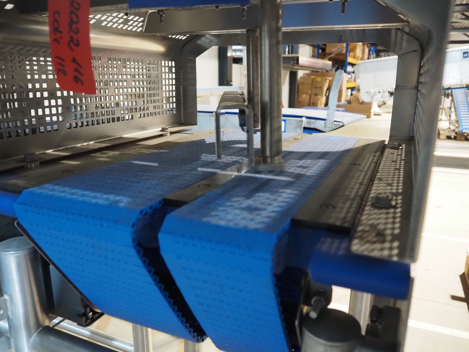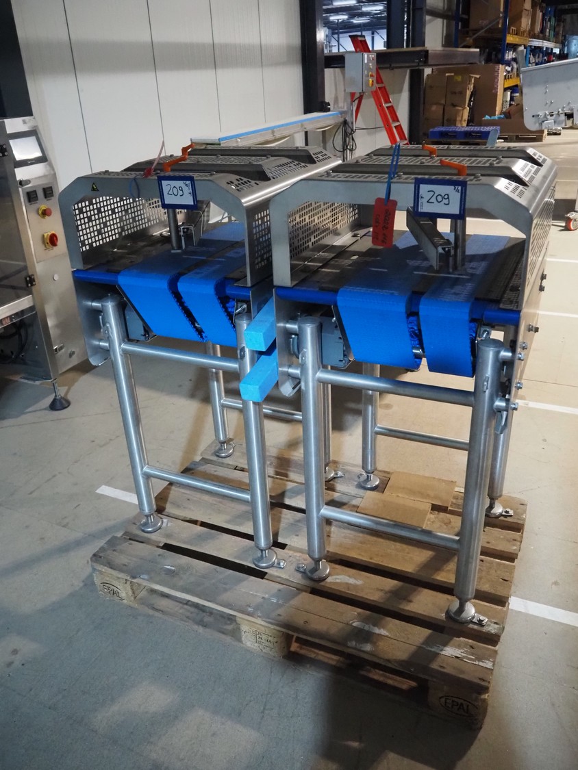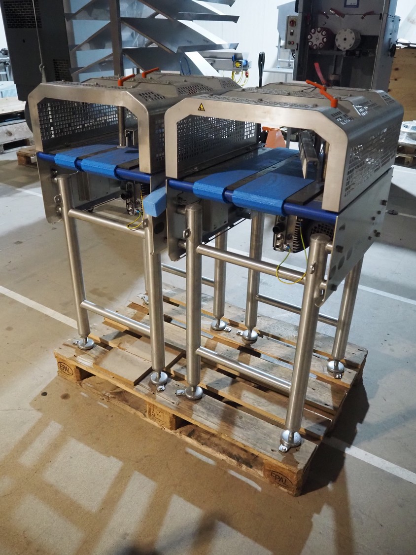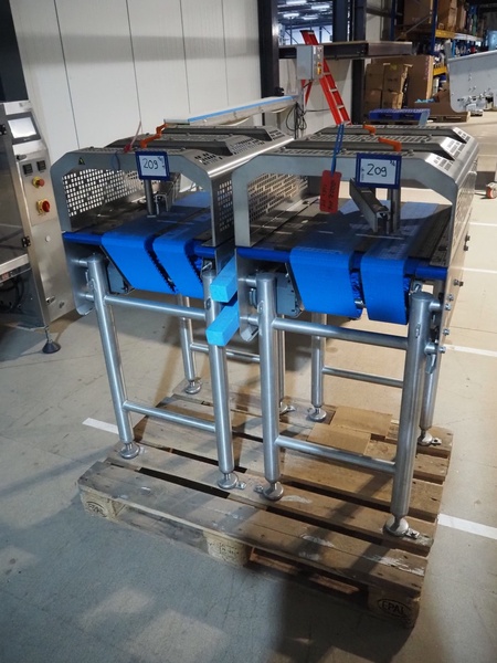 2 Jasa Packaging Solutions product turning conveyors, model: SIM-1000 DRAAI UNIT, year of construction: 2019, 400 V, 3 Ph, 0.47 kW, 16 A, 6 bar, weight: (2x) 60 kg, belt width: (2x) 150 mm and 100 mm, total dimensions: (2x) 600 mm x 550 mm x 1150 mm.