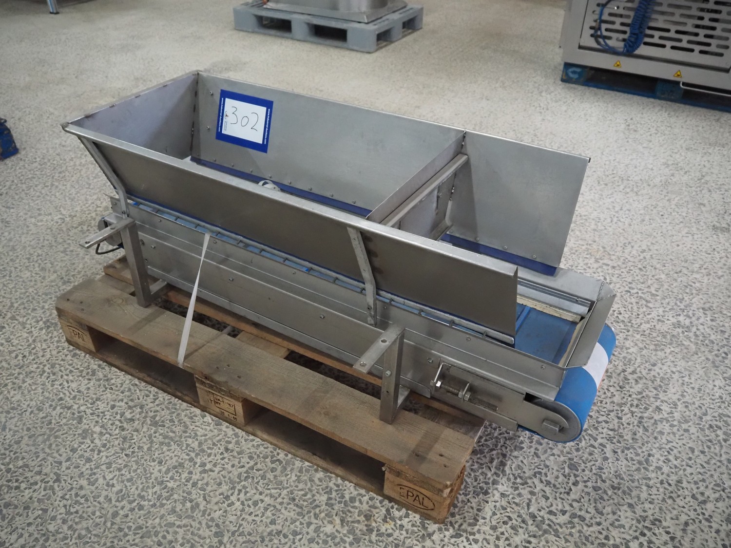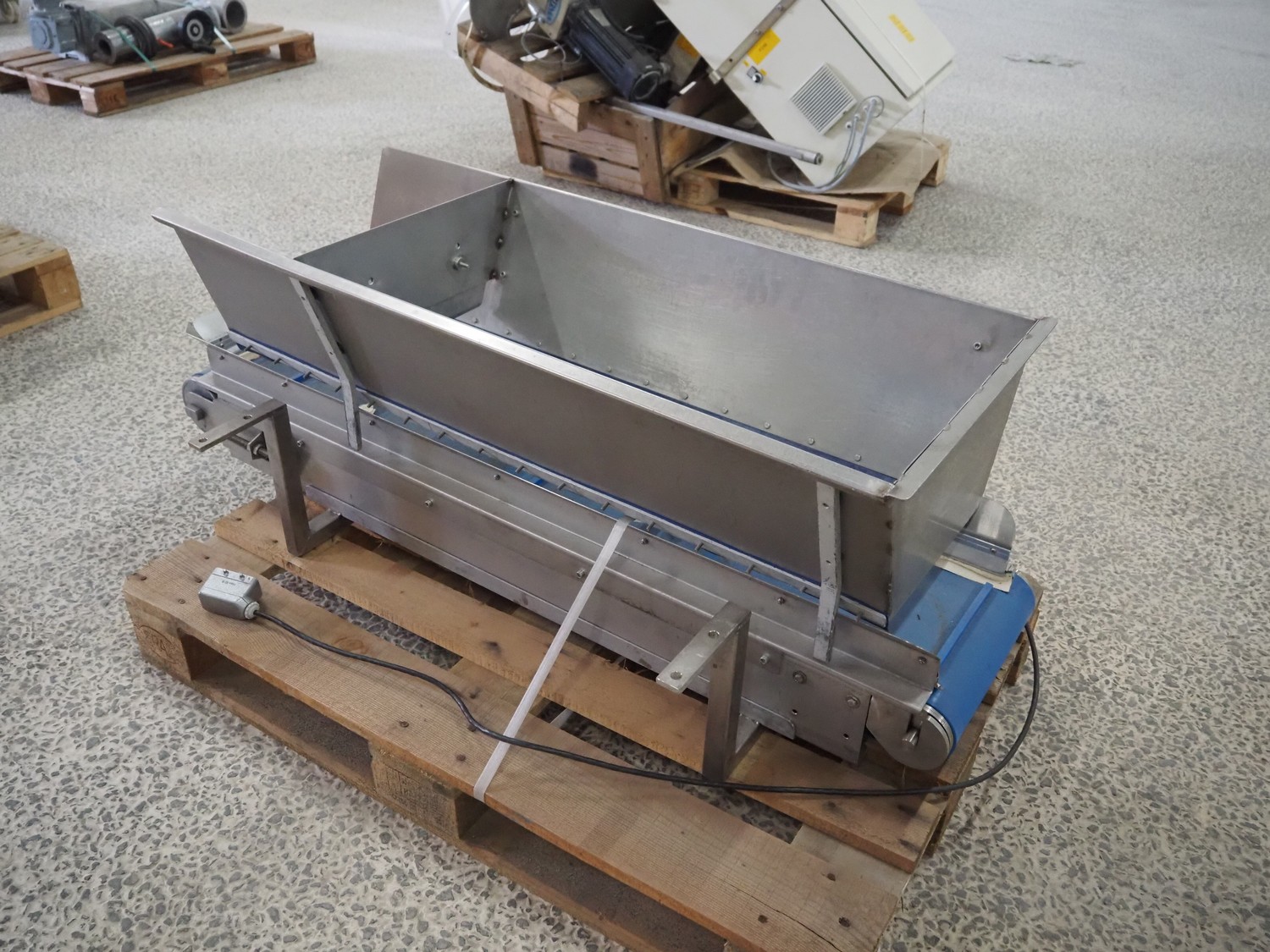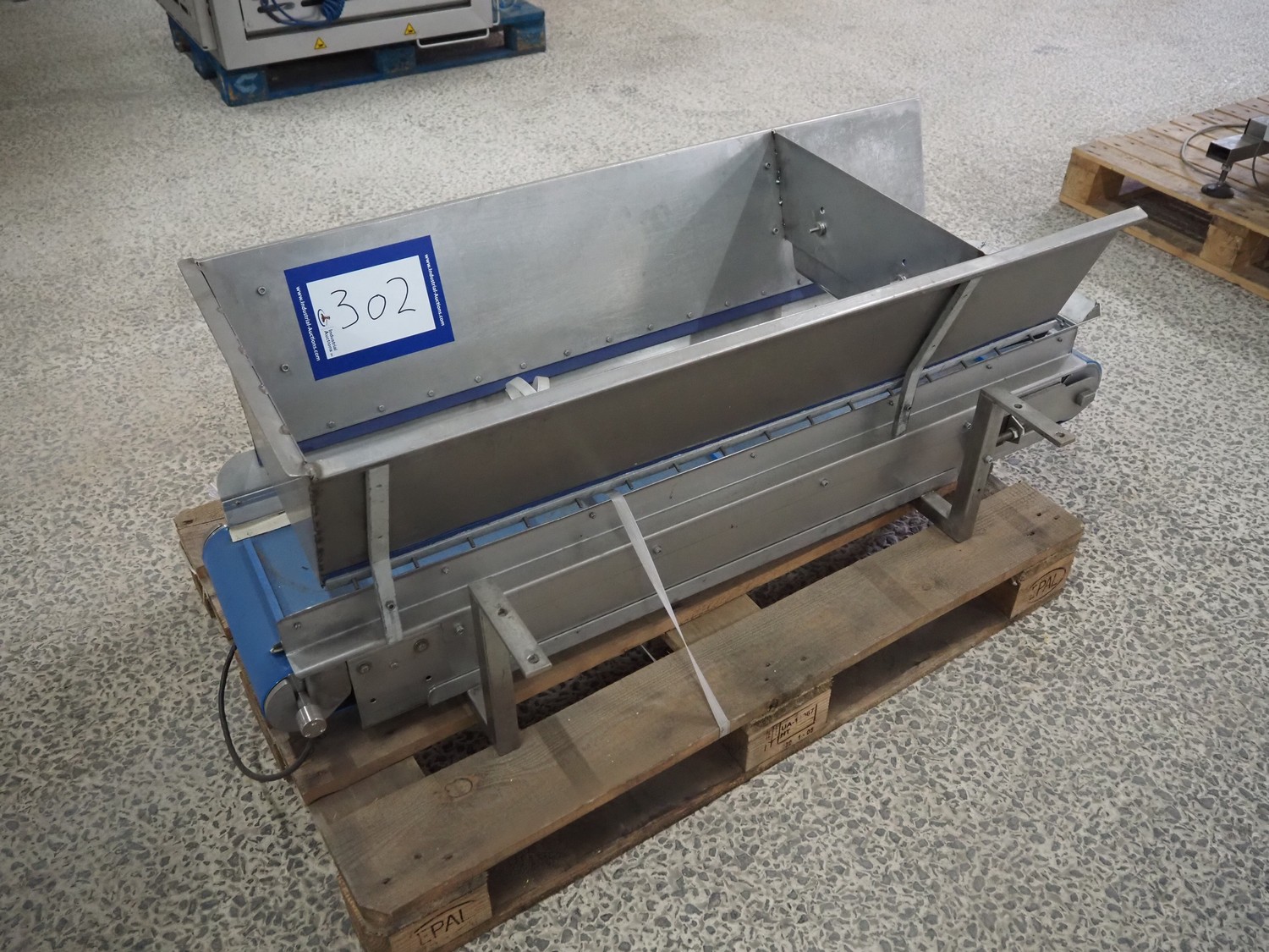 Transport belt, s/s frame, plastic belt, belt width: 290 mm, total dimensions: 1500 mm x 600 mm x 500 mm.
