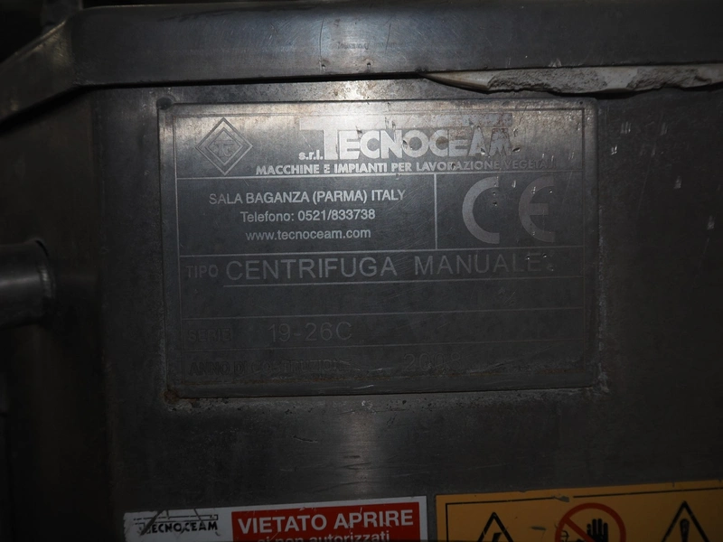 Technoceam vegetable centrifuge, type: centrifuga manuale, serial number: 19/32, year of construction: 2008, inside dimensions: Ø 420 mm x 300 m, total dimensions: 1100 mm x 600 mm x 800 mm.