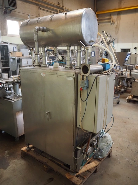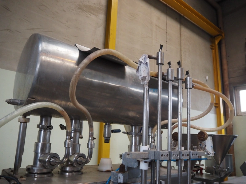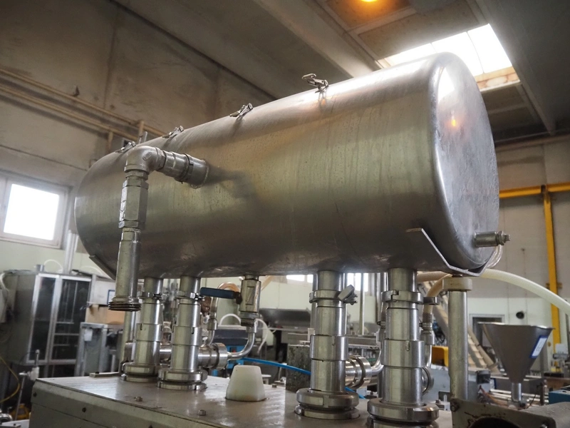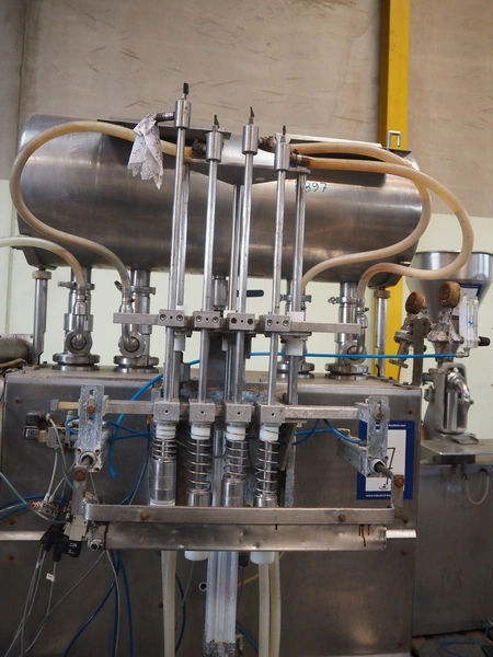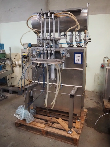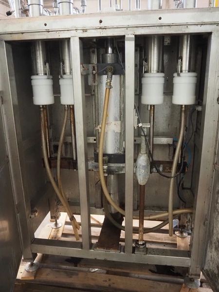 Minab s/s filling machine, 380 V, 4 filling heads, nozzle diameter: Ø 18 mm, total dimensions: 1250 mm x 950 mm x 2100 mm.