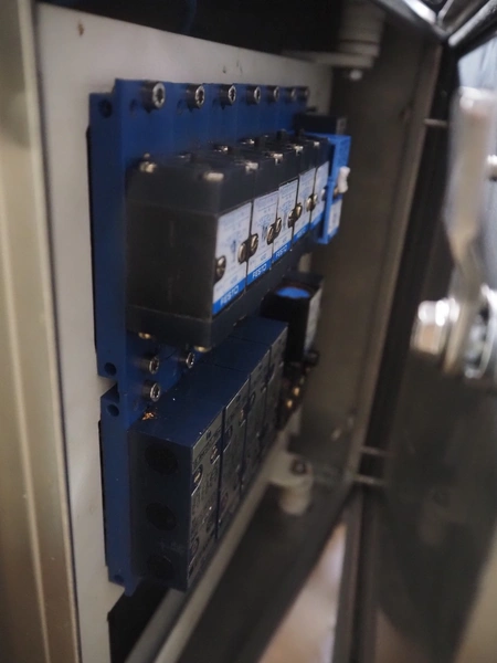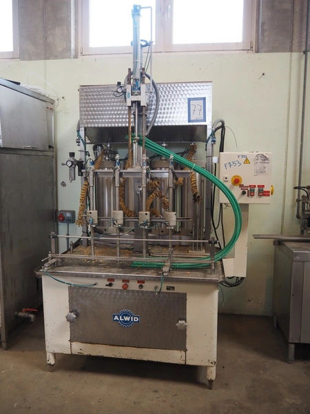 Alwid s/s filling machine, type: NWIDUNIVERSAL-D, serial number: 200489, 380 V, dosing range 0-12.5 liter, prepared for conveyor, total dimensions: 1850 mm x 1400 mm x 2750 mm.