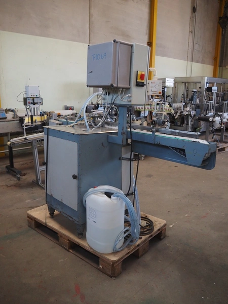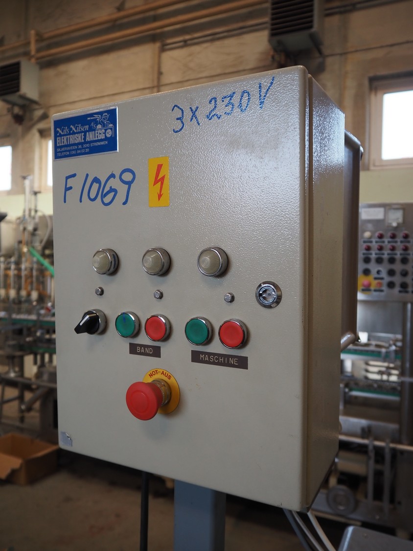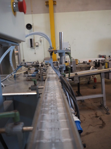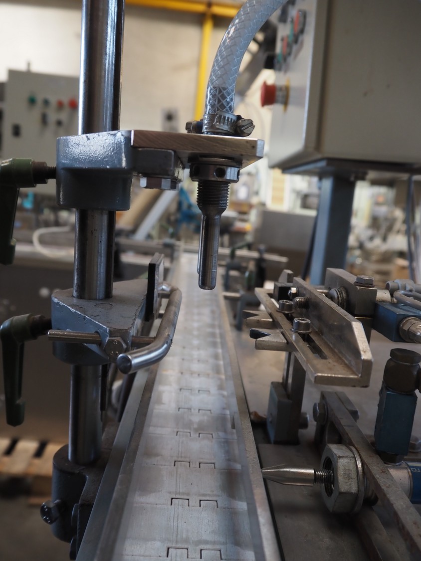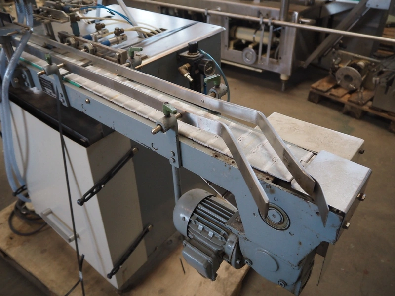 J. Kugler & Co. filling machine, type: Minimat, serial number: 11877, year of construction: 1979, 220 V, 2 filling heads, filling head diameter: Ø 10 mm, plastic belt, belt width: 85 mm, total dimensions: 2000 mm x 650 mm x 1550 mm.