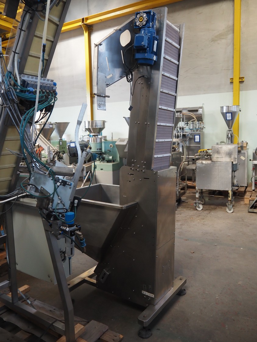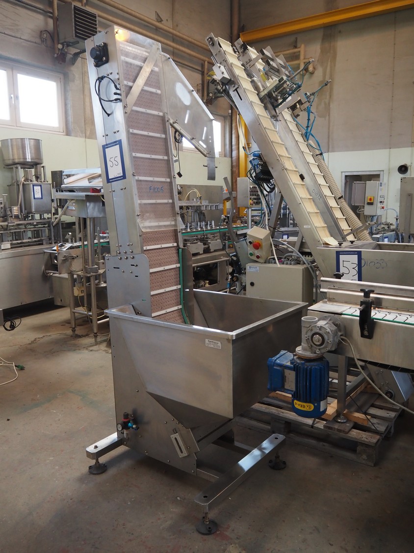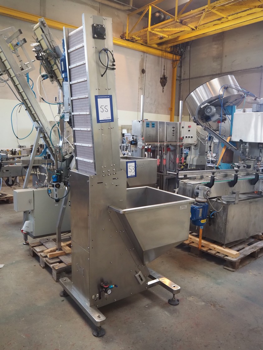 Shanghai Npack Automation Equipment CO.,LTD cap feeder, model: NP-LC, 1.6 kW, belt width: 300 mm, divider height: 15 mm, distance between dividers: 100 mm, elevating height: 2220 mm, capacity; 12000 pcs/h, total dimensions: 1000 mm x 800 mm x 2300 mm.