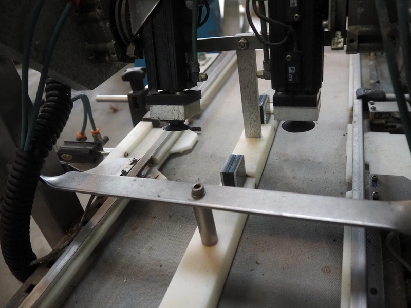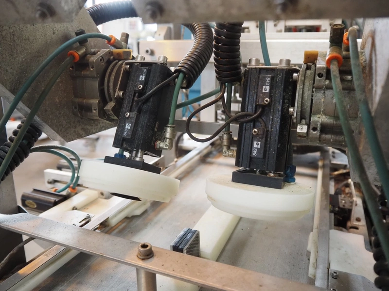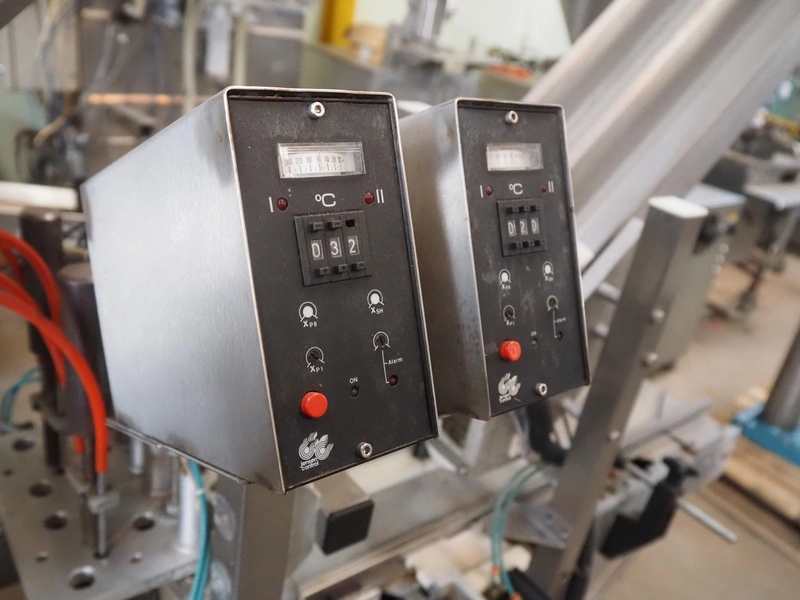 Soco System lid sealing machine, 380 V, 2 lanes, plastic belt, belt width: 280 mm, dimensions: 2050 mm x 700 mm x 1850 mm.