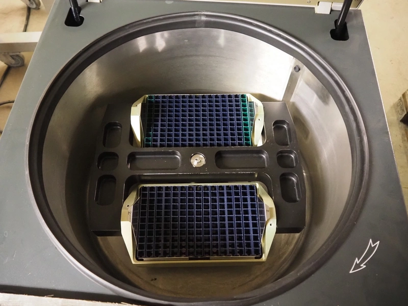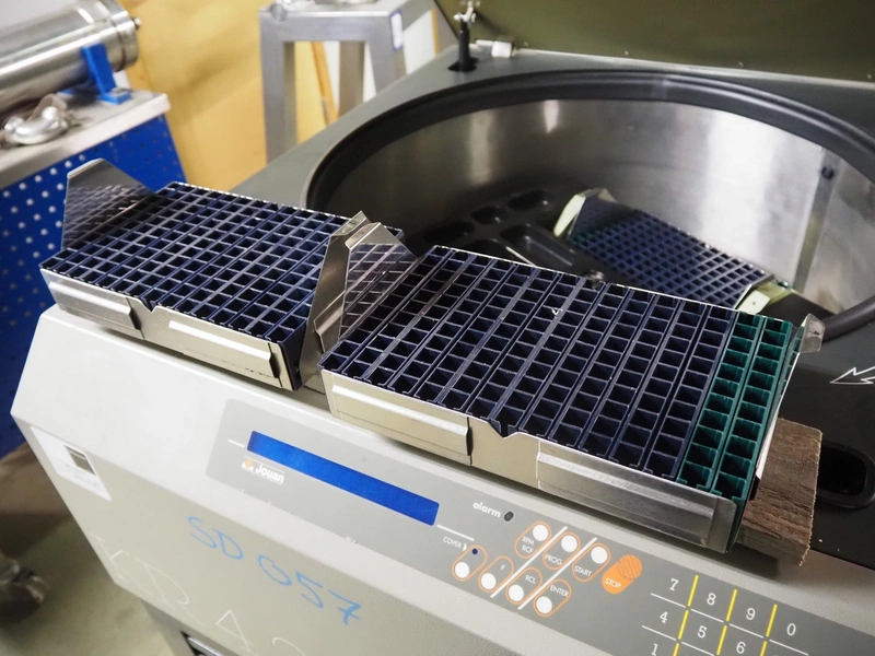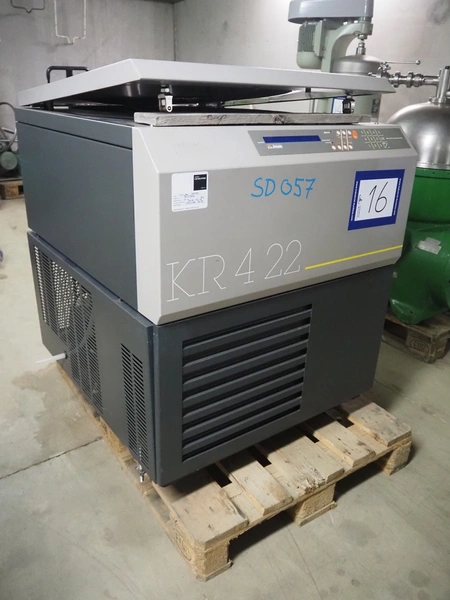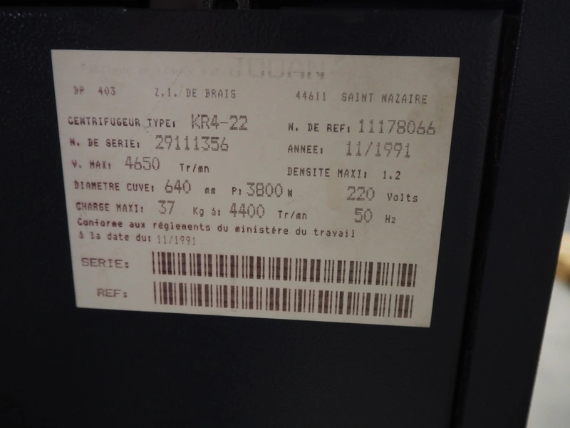 Jouan centrifuge, type: KR4-22, serial number; 29111356, year of construction: 11/1991, 220 V, 50 Hz, 3800 W, 4900 rpm, maximum capacity: 6400 ml, dimensions: 900 mm x 800 mm x 950 mm. Including spare dyes.