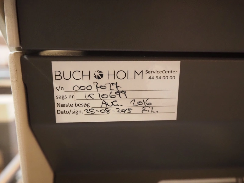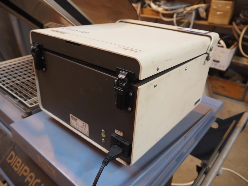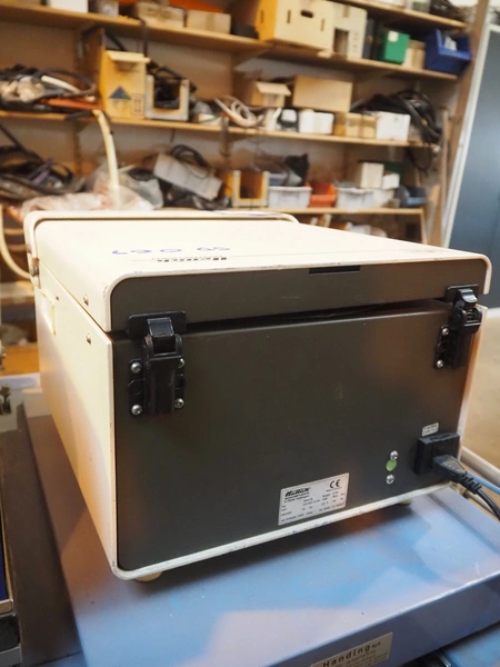 Hettich centrifuge, type: 1601, number: 0007027-01-00, year of construction: 1998, 230/240 V, 50 Hz, 0.6 A, 140 W, maximum of 6000 rpm, dimensions: 450 mm x 400 mm x 300 mm.