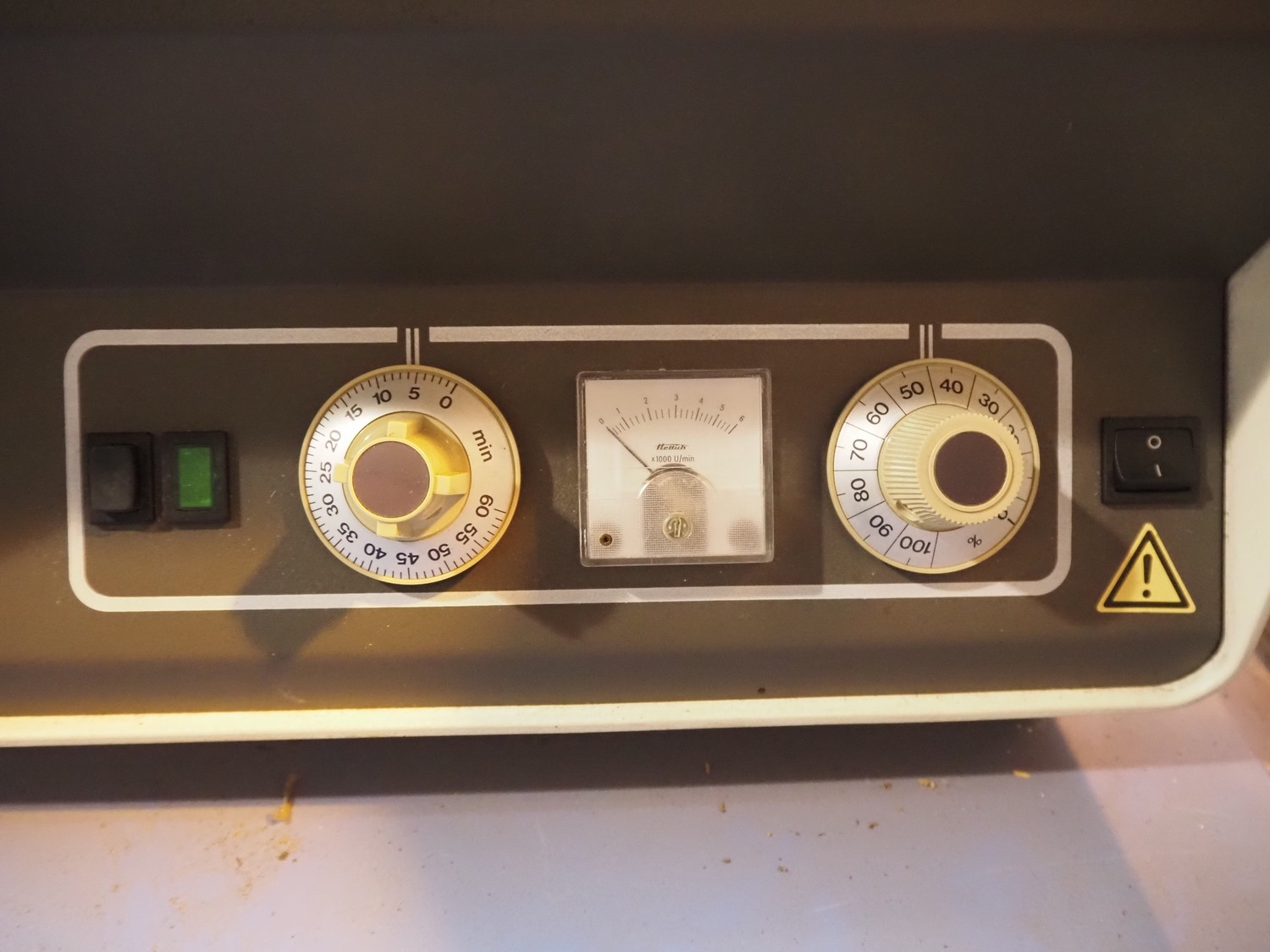 Hettich centrifuge, type: 1601, number: 0007027-01-00, year of construction: 1998, 230/240 V, 50 Hz, 0.6 A, 140 W, maximum of 6000 rpm, dimensions: 450 mm x 400 mm x 300 mm.