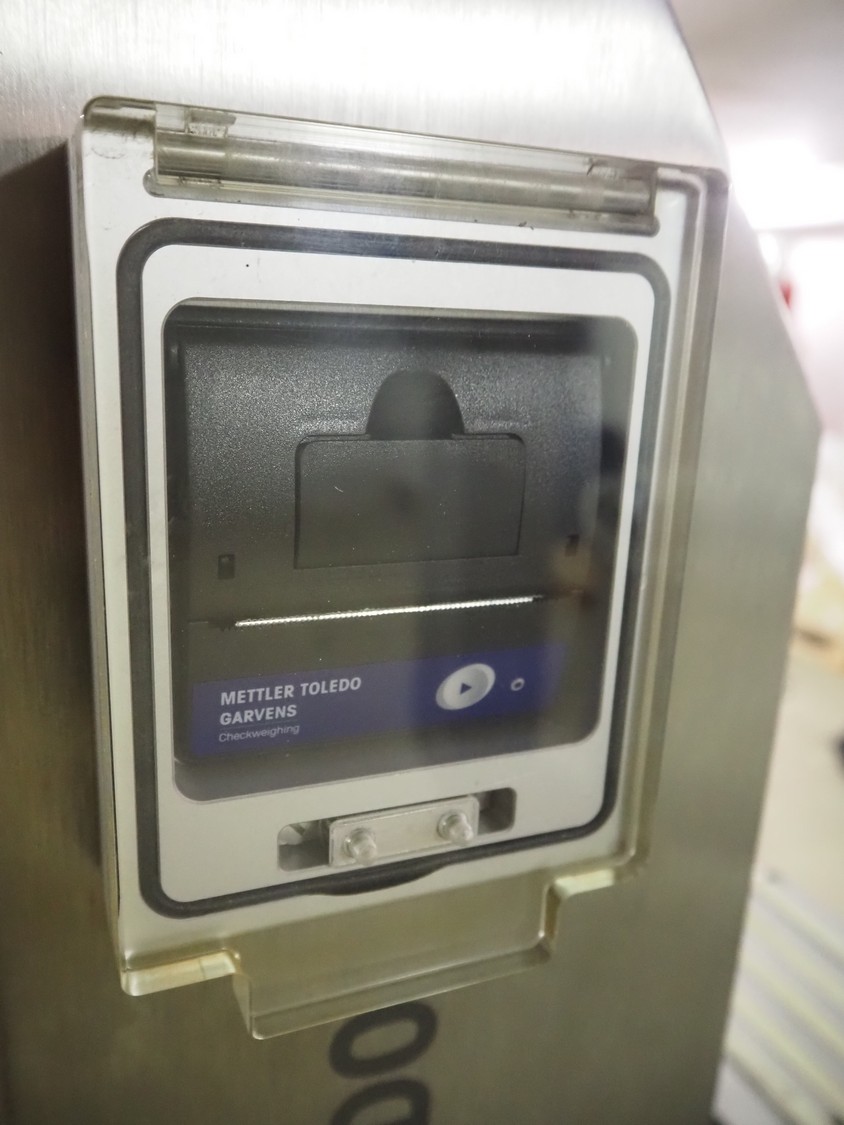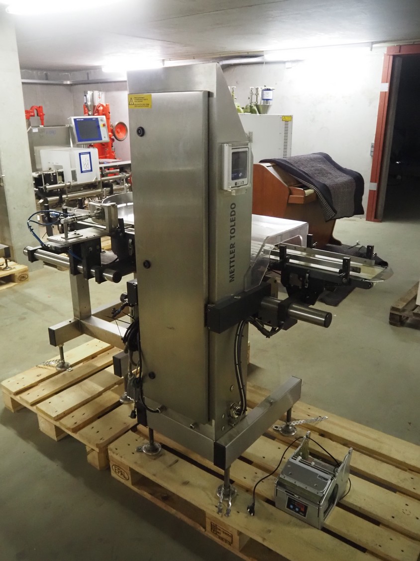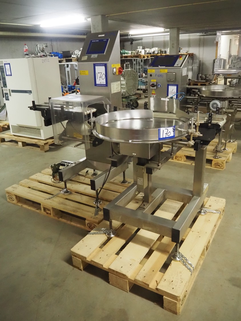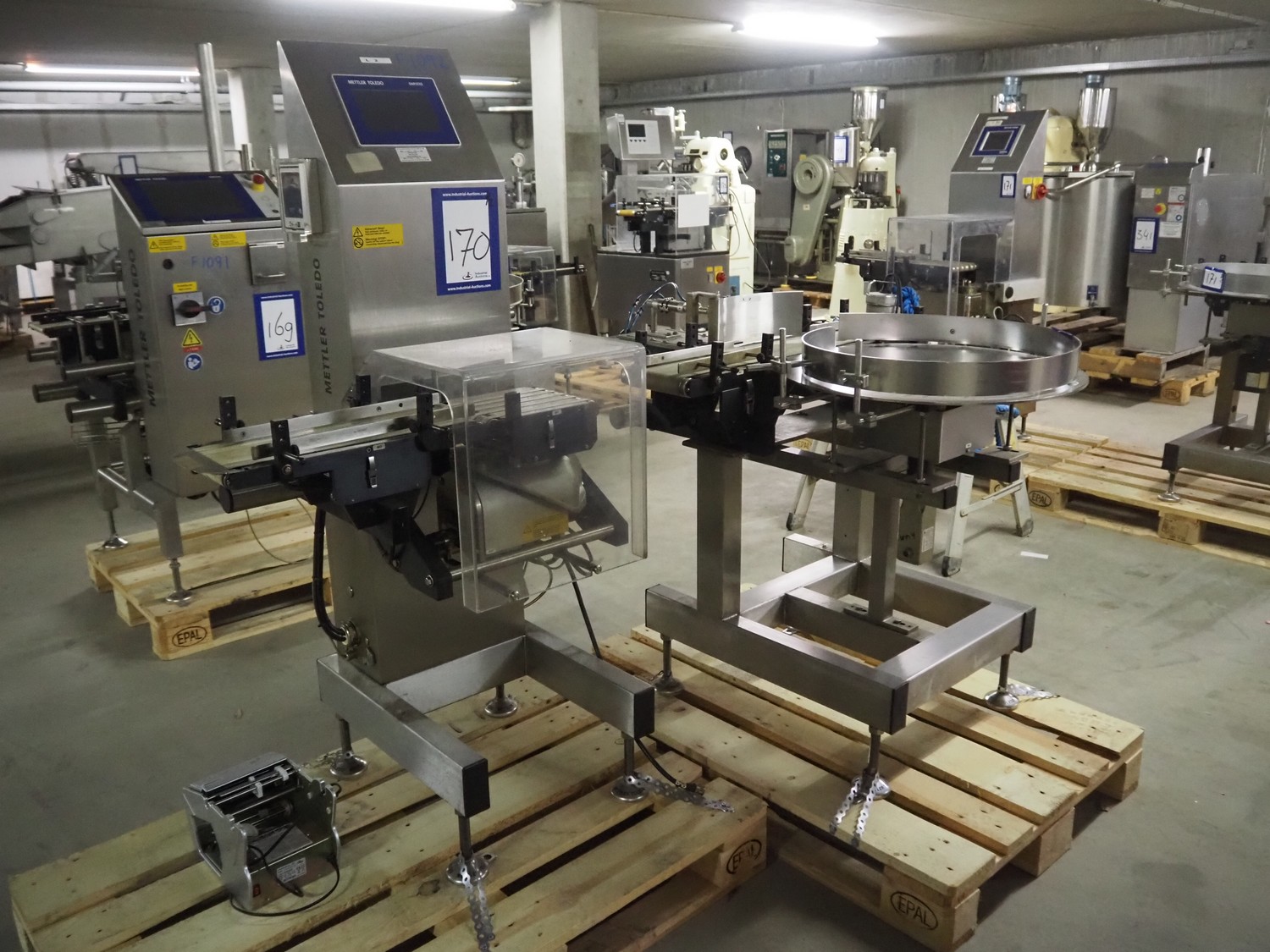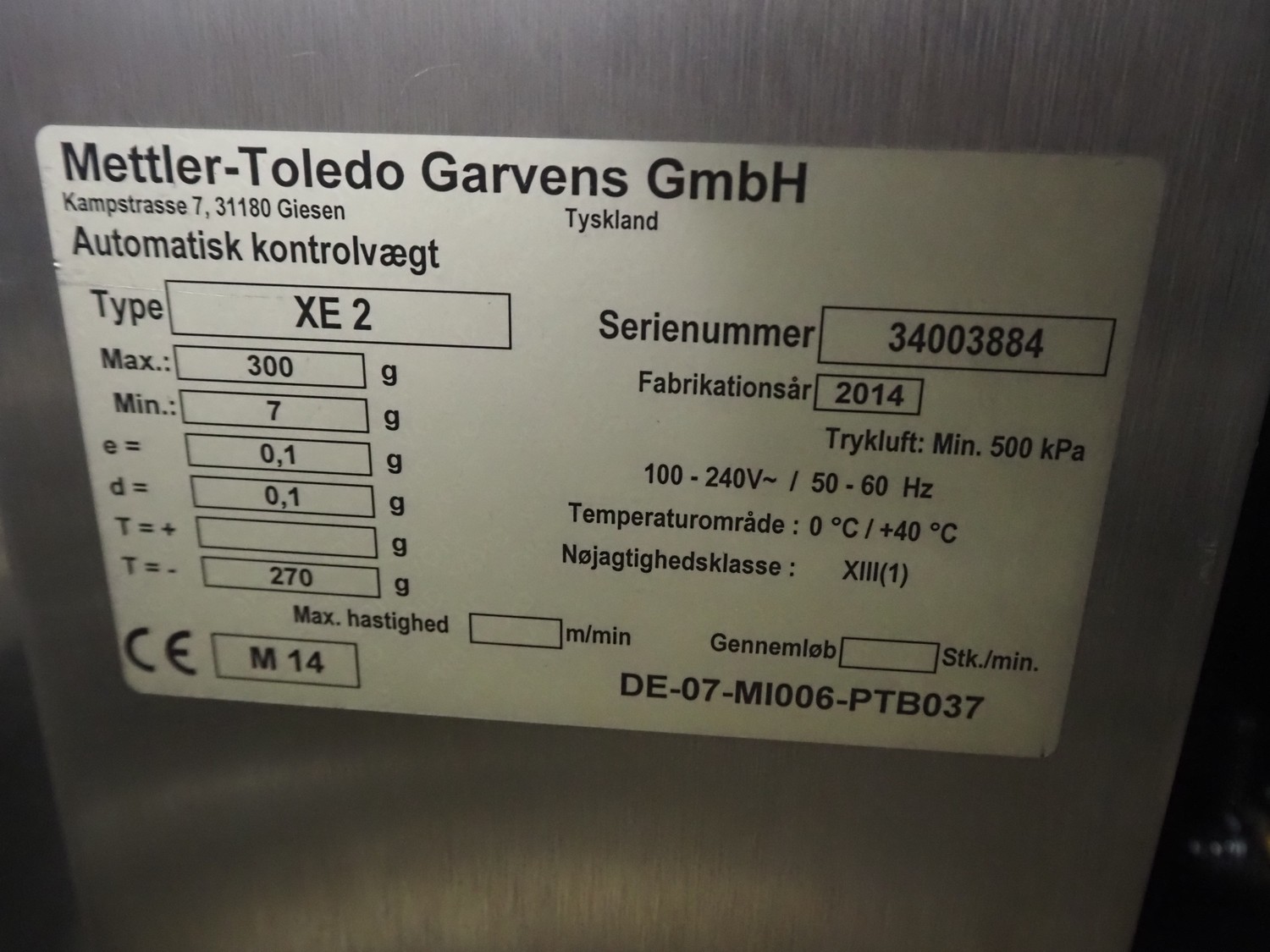 Mettler-Toledo Garvens GmbH checkweigher with turning table rejector, type: XE 2, serial number: 34003884, year of construction: 2014, 100-240 V, 50-60 Hz, maximum weight: 300 gram, minimum weight: 7 gram, e=d= 0.1 gram, T= - 270 gram, plastic belt, belt width: 150 mm, dimensions checkweigher: 800 mm x 630 mm x 1420 mm, turning table rejector, diameter turning table: 600 mm, plastic belt, belt width: 150 mm, total dimensions rejector: 1140 mm x 830 mm x 880 mm.