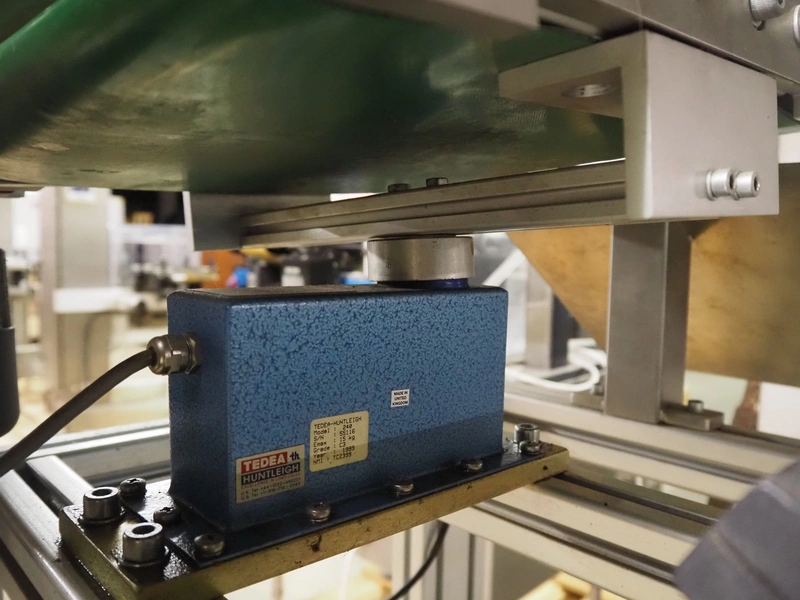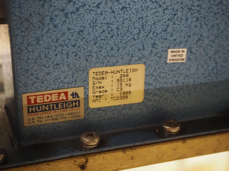 Busch-Werke AG checkweigher, model: MINIPOND 25, number: 105196, year of construction: 1999, maximum weight: 15 kg, minimum weight: 0.1 kg, e=d=d: 0.005 kg, T= -15 kg, plastic belt, belt width: 250 mm, total dimensions: 860 mm x 600 mm x 1280 mm.