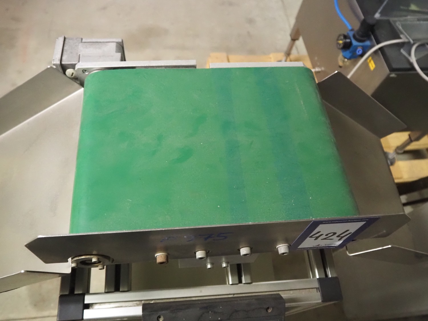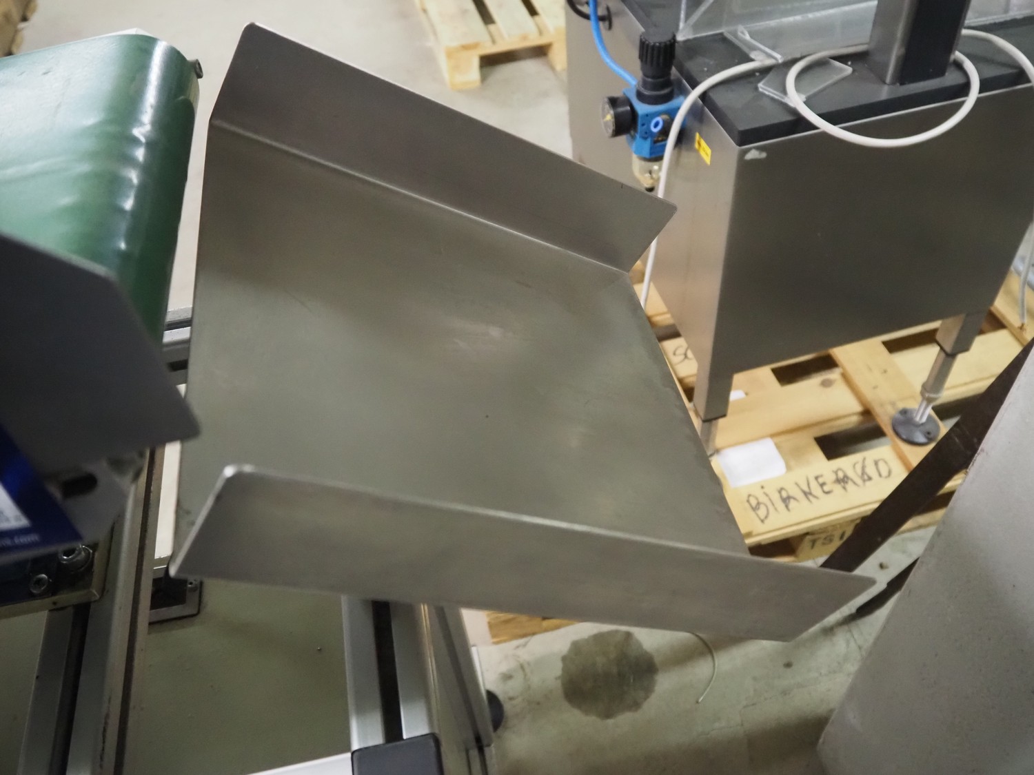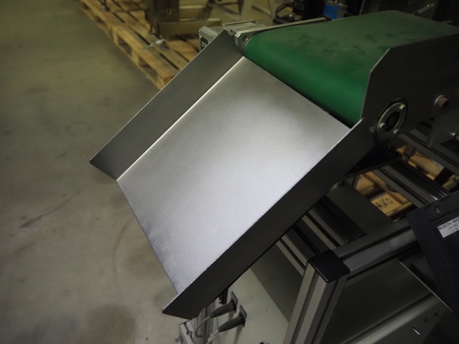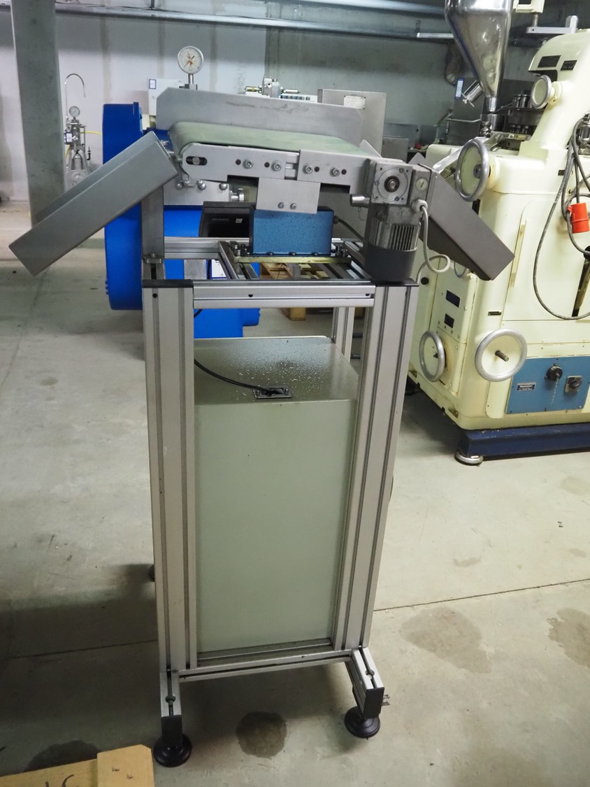Busch-Werke AG checkweigher, model: MINIPOND 25, number: 105196, year of construction: 1999, maximum weight: 15 kg, minimum weight: 0.1 kg, e=d=d: 0.005 kg, T= -15 kg, plastic belt, belt width: 250 mm, total dimensions: 860 mm x 600 mm x 1280 mm.