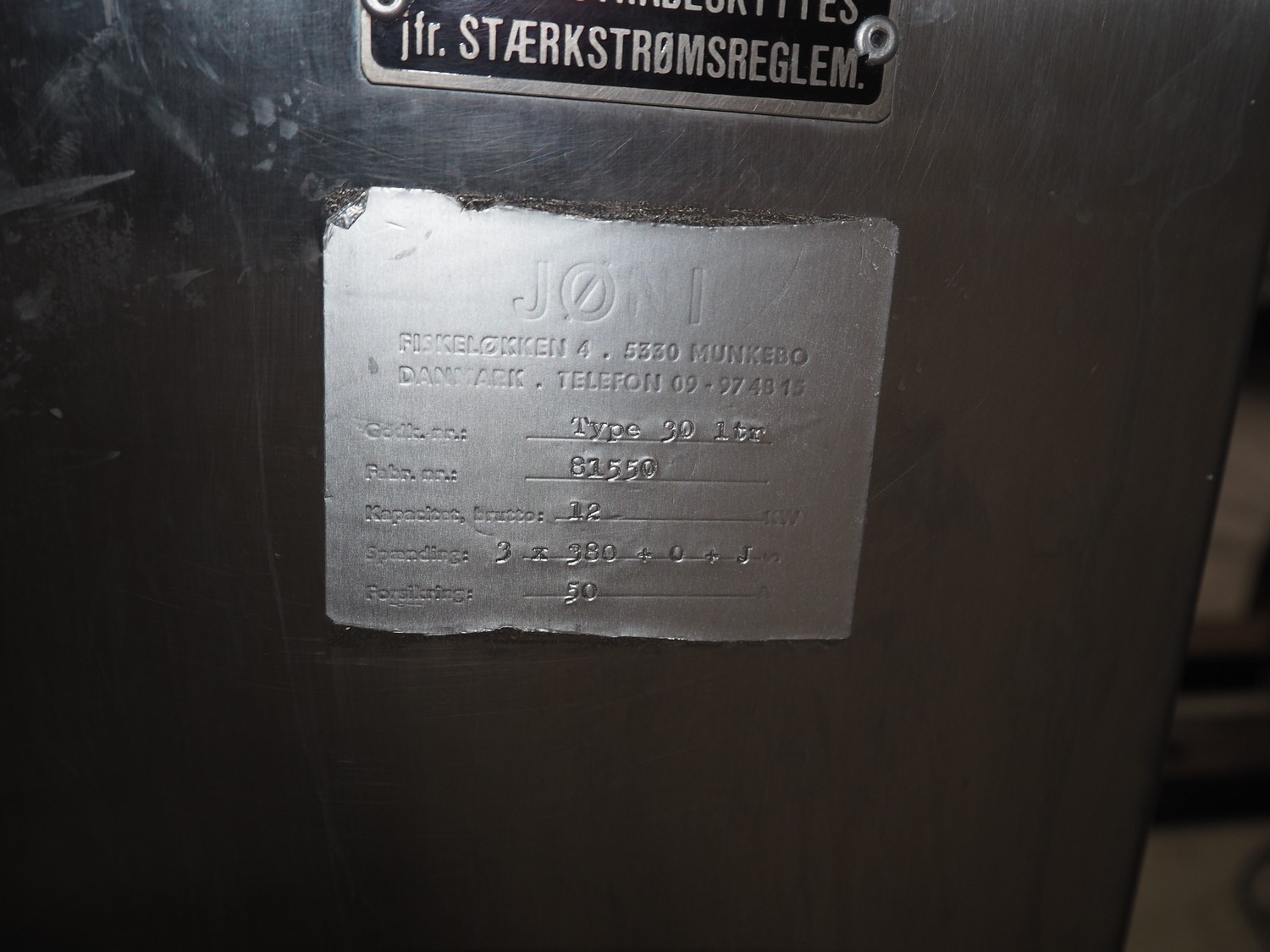 Jøni Foodline A/S tiltable cooking vessel, type: 30 LTR, factory number: 61550 , 380 V, 3 Ph, 50 A, 12 kW, s/s vessel, volume: 30 liter, total dimensions: 1000 mm x 700 mm x 900 mm.