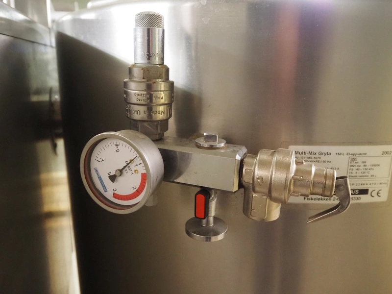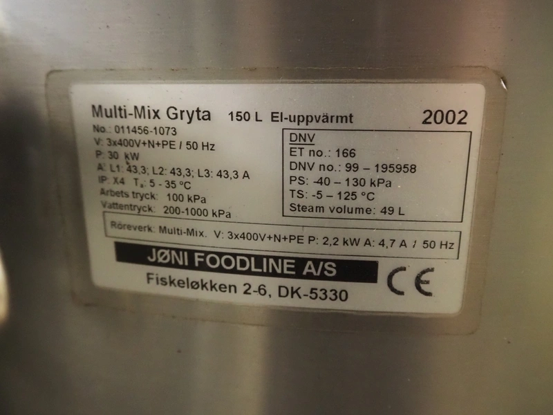 Jøni Foodline A/S cooking vessel, model: Multi-Mix Gryta, number: 011456-1073, year of construction: 2002, 400 V, 3 Ph, 50 Hz, 43.3 A, 30 kW, volume: 150 liter, steam volume: 49 liter, dimensions: 1450 mm x 1350 mm x 1500 mm.