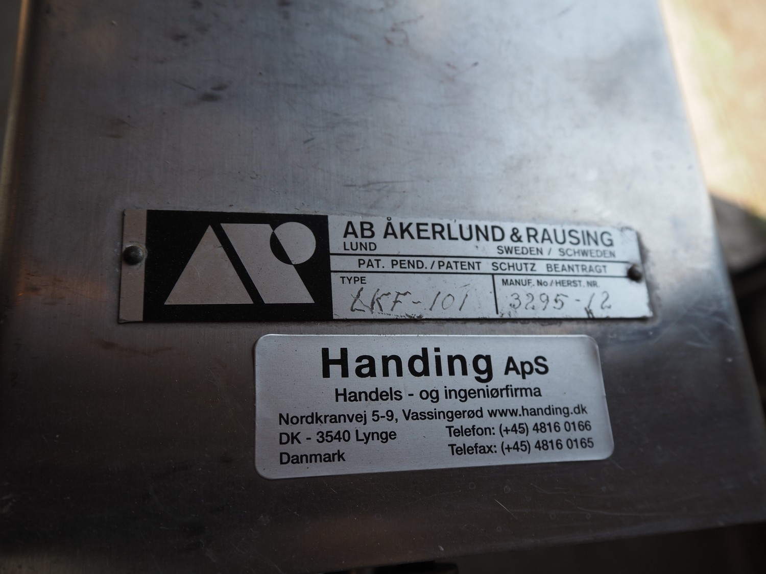 AB Åkerlund & Rausing pneumatic s/s filling machine, type: LKF 101, serial number: 3295-12, dosage: 0-1000 ml, foot control, dimensions: 1050 mm x 650 mm x 2050 mm.