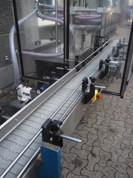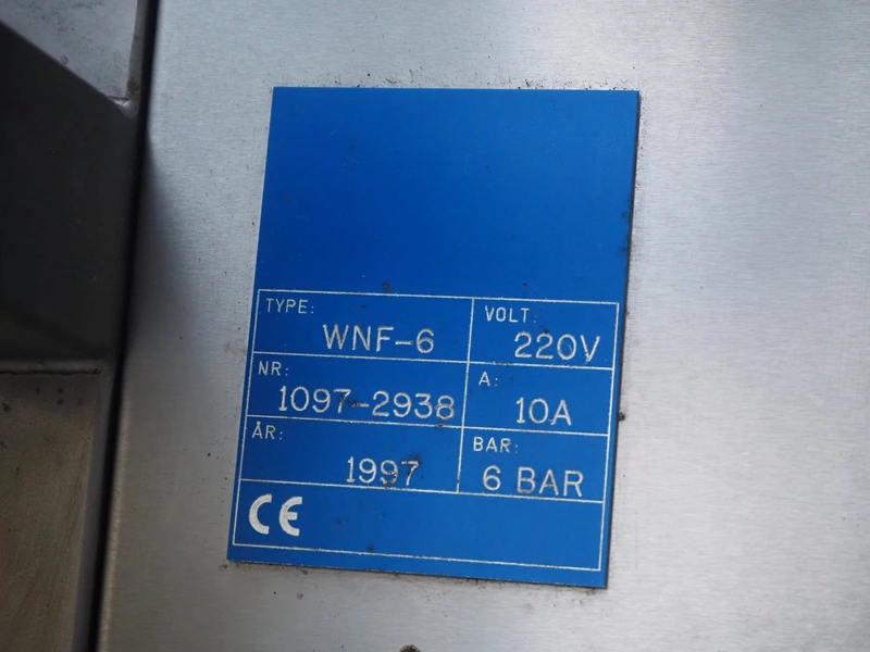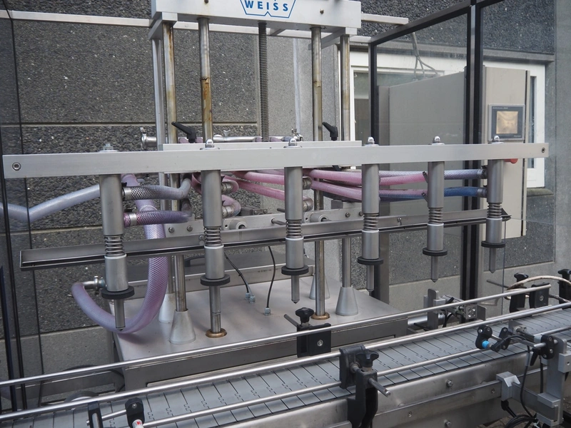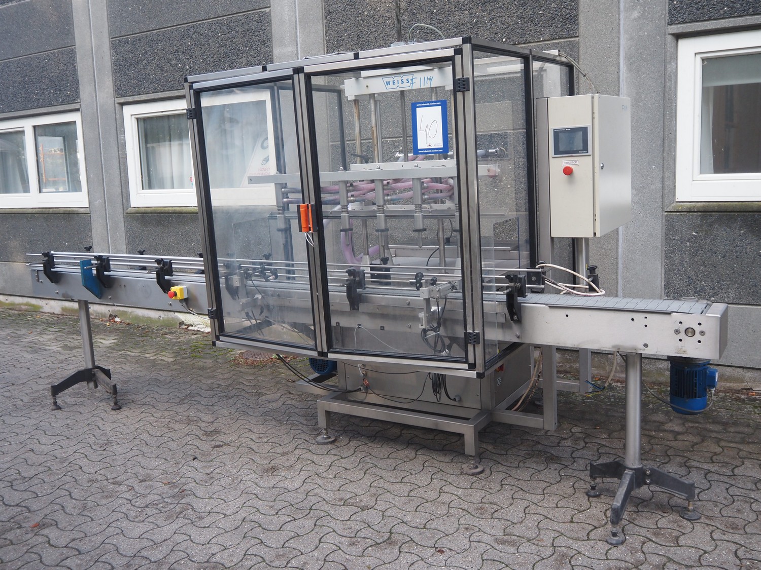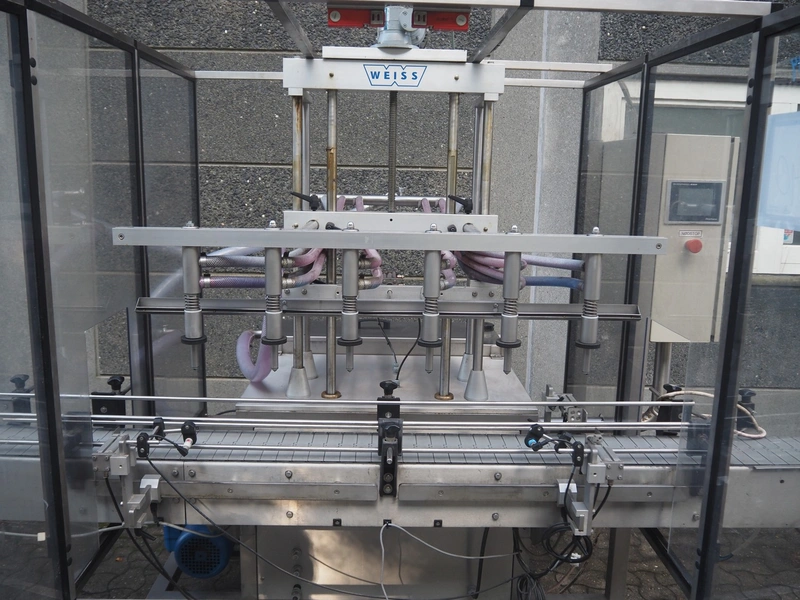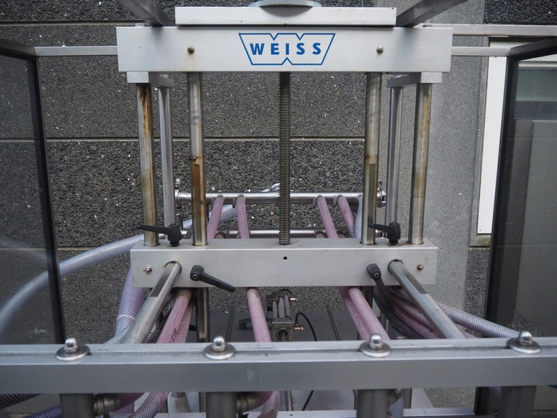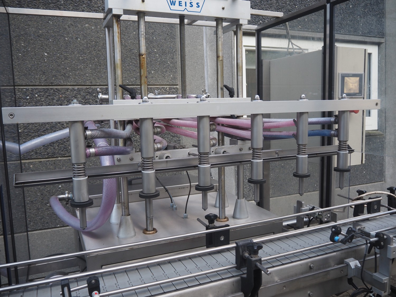 Weiss filling machine, type: WNF-6, serial number: 1097-2938, year of construction: 1997, 220 V, 10 A, 6 bar, plastic belt, belt width: 190 mm, working width: 140 mm, 6 filling heads, filling head diameter: Ø 20 mm, total dimensions: 4050 mm x 1650 mm x 2350 mm.