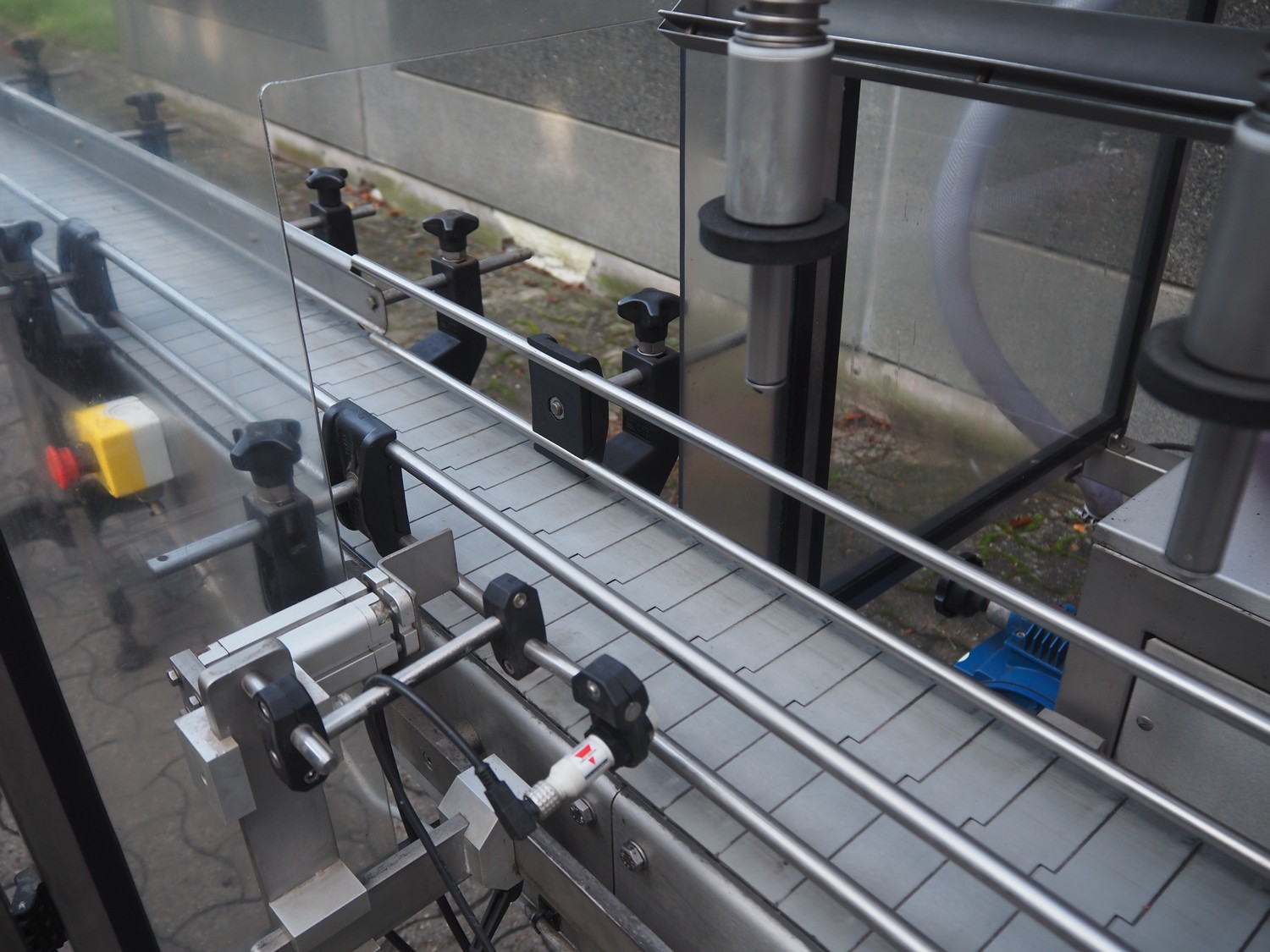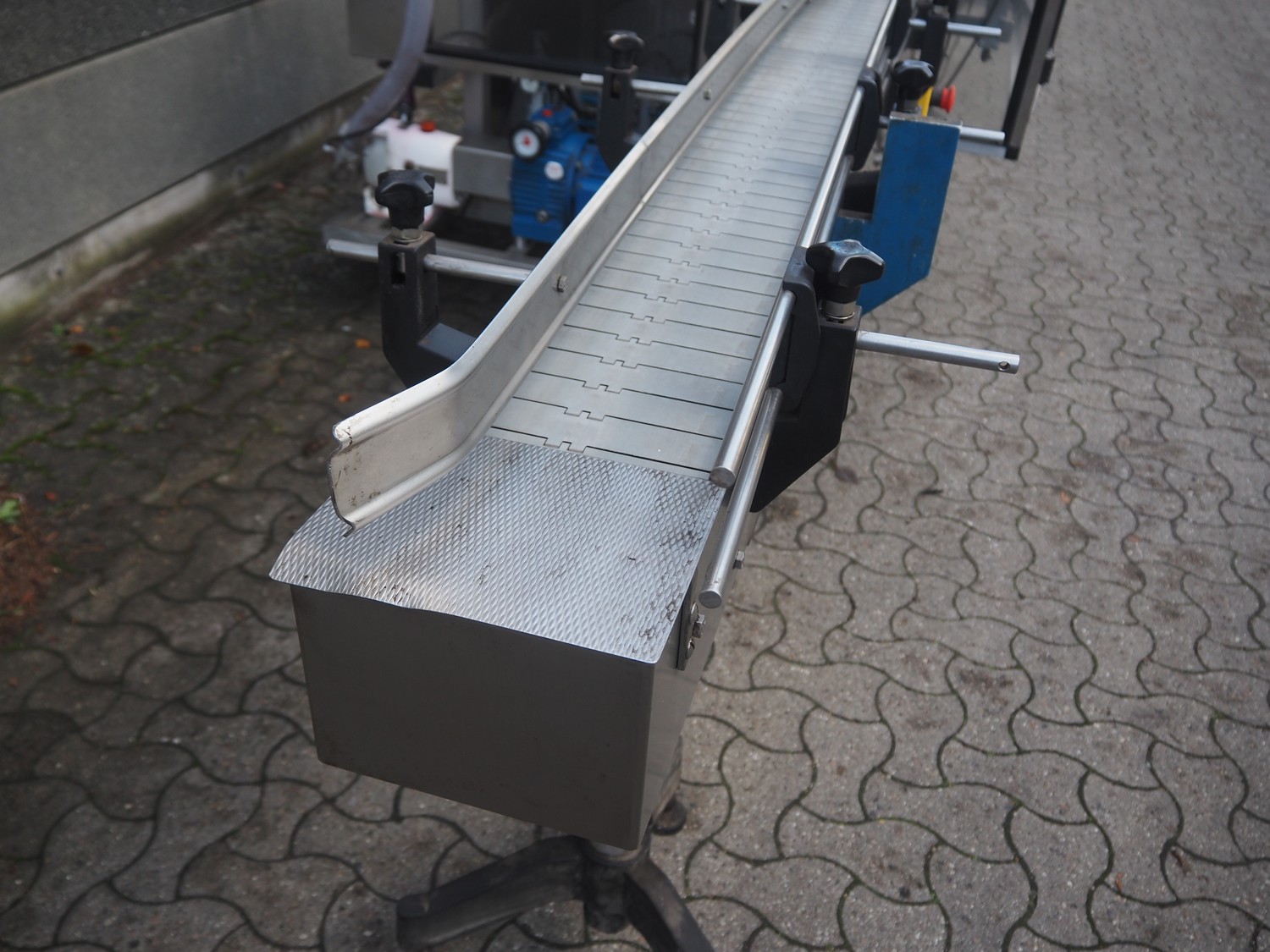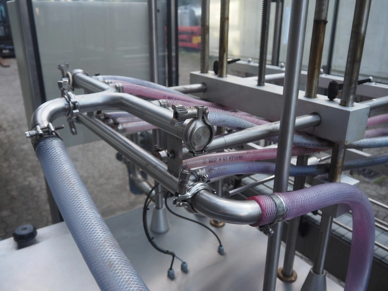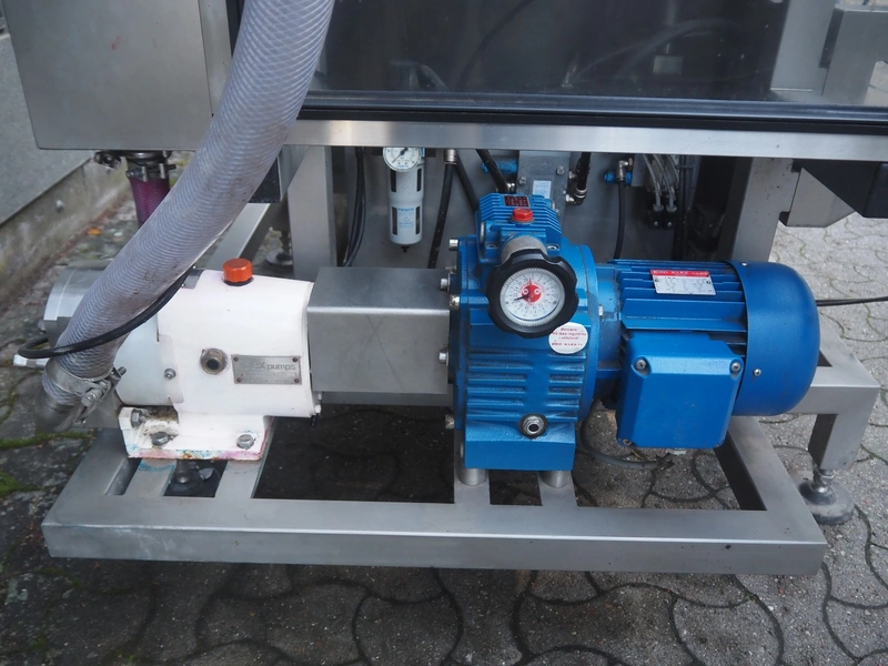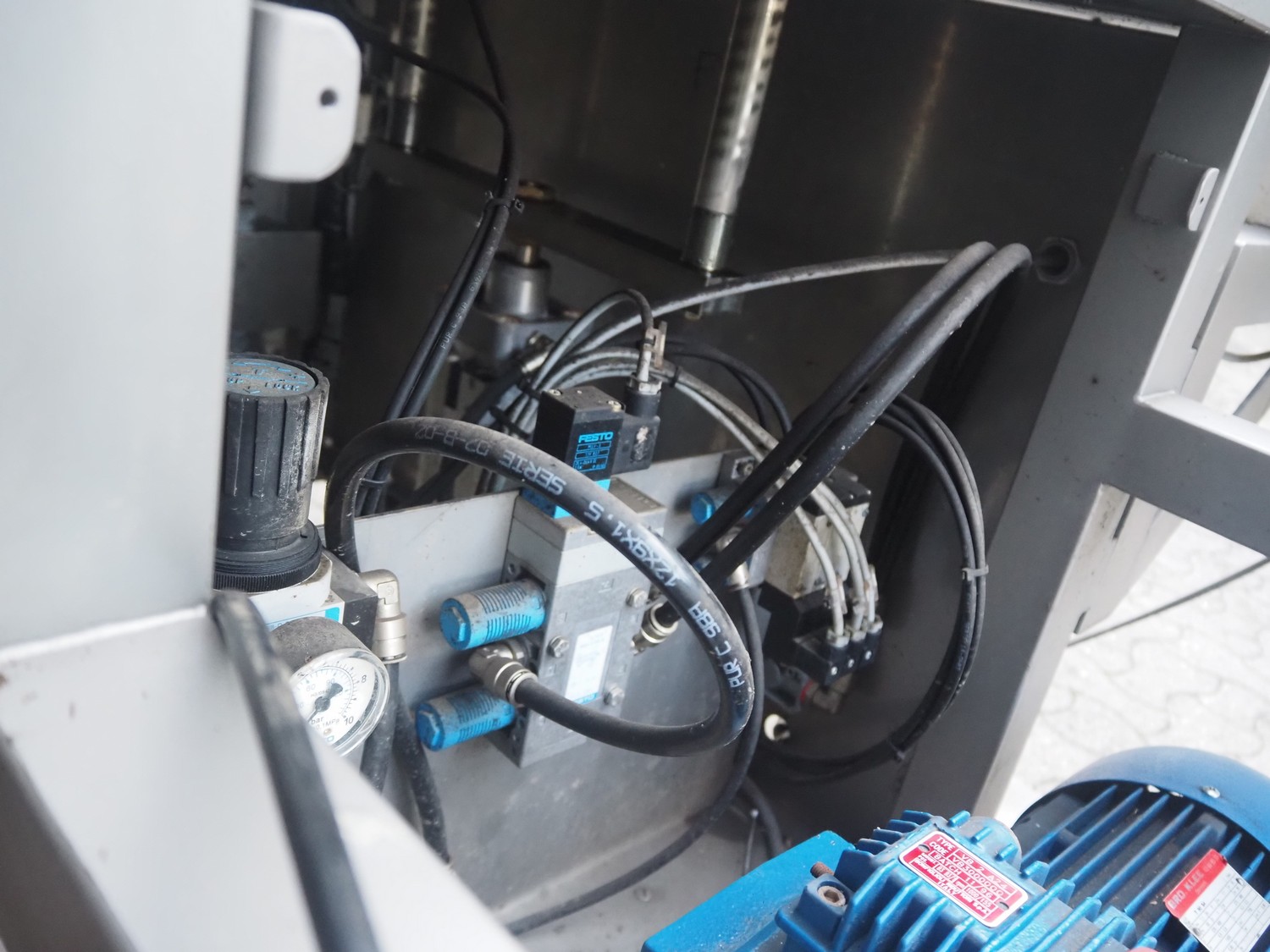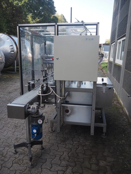 Weiss filling machine, type: WNF-6, serial number: 1097-2938, year of construction: 1997, 220 V, 10 A, 6 bar, plastic belt, belt width: 190 mm, working width: 140 mm, 6 filling heads, filling head diameter: Ø 20 mm, total dimensions: 4050 mm x 1650 mm x 2350 mm.