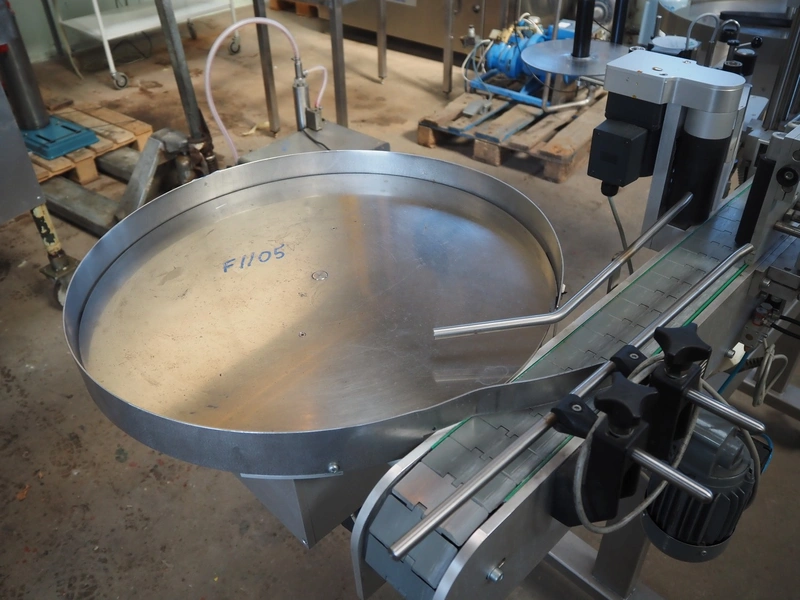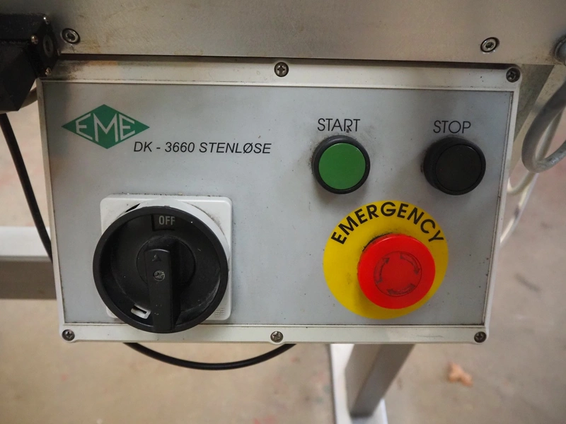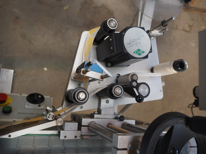 EME labelling machine, type: 3 valse 120/S4, 230 V, 600 W, maximum label height: 120 mm, total dimensions: 1115 mm x 2200 mm x 1450 mm.