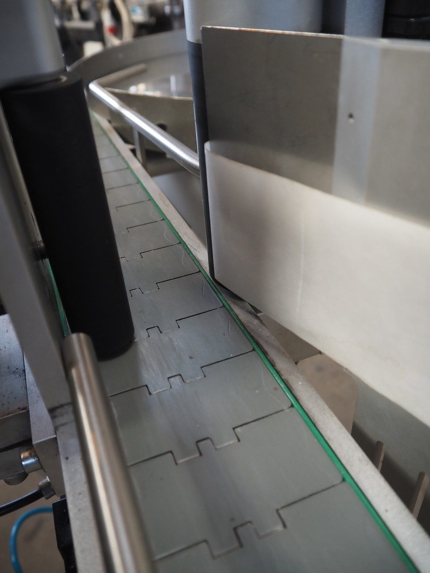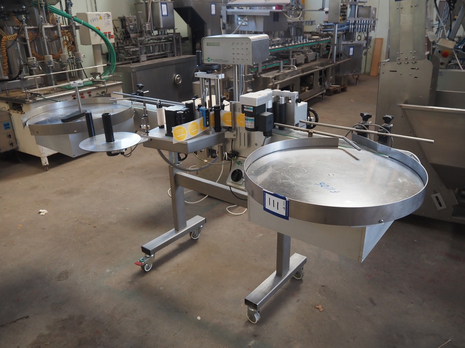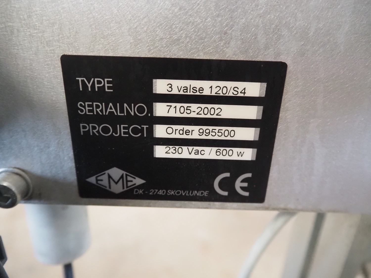 EME labelling machine, type: 3 valse 120/S4, 230 V, 600 W, maximum label height: 120 mm, total dimensions: 1115 mm x 2200 mm x 1450 mm.