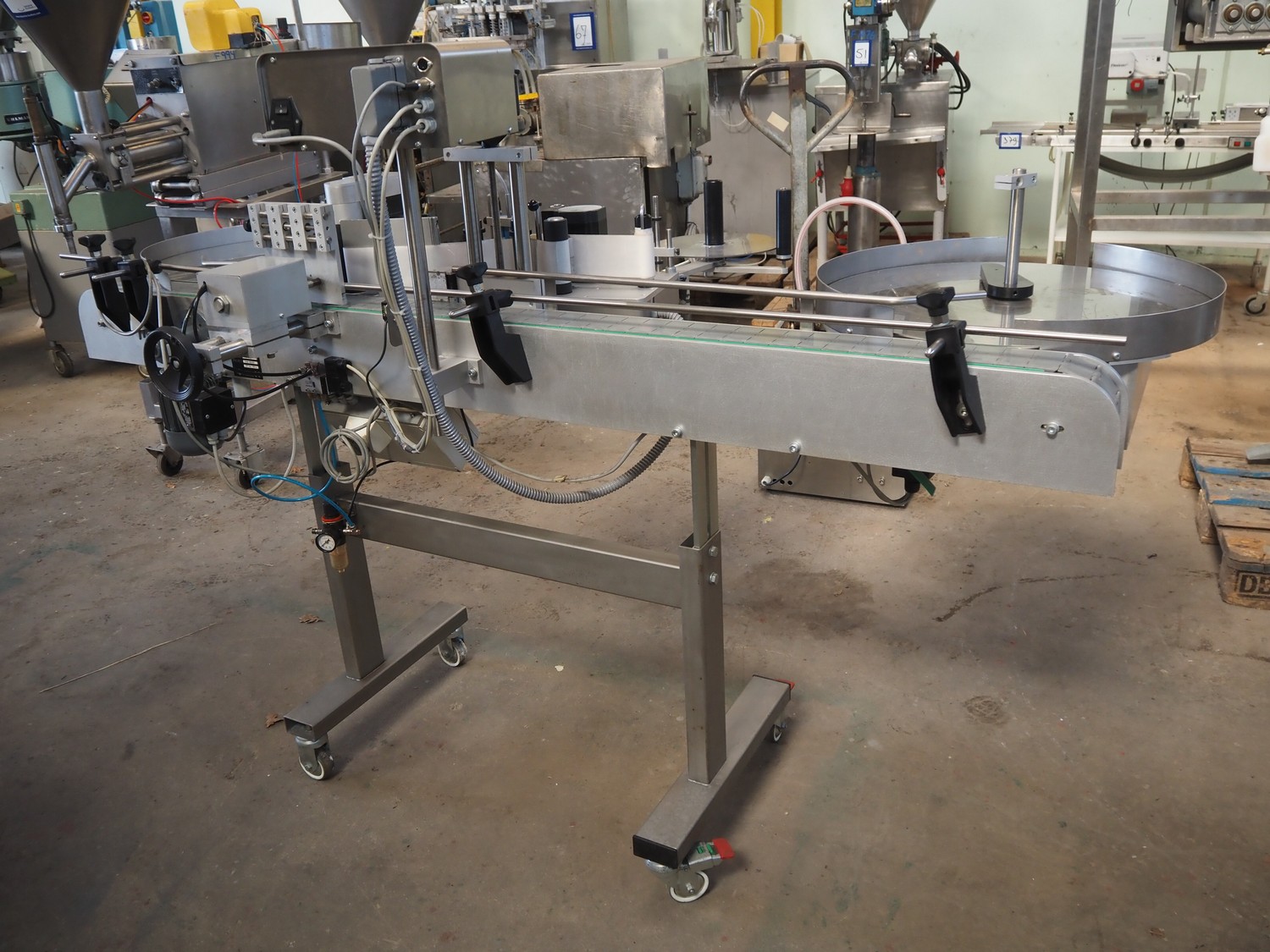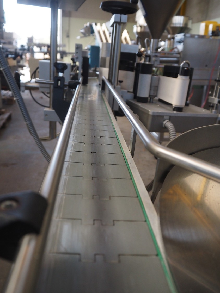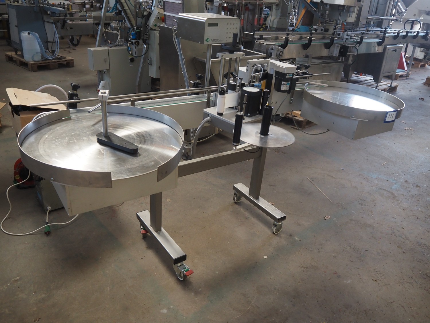 EME labelling machine, type: 3 valse 120/S4, 230 V, 600 W, maximum label height: 120 mm, total dimensions: 1115 mm x 2200 mm x 1450 mm.