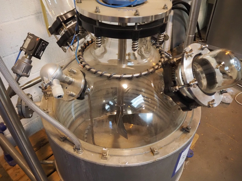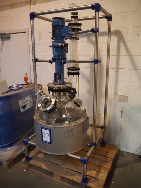 QVF Engineering GmbH glass reactor, type: BHKDE 100E-1, number: 50508101, year of construction: 2005, weight: 93.5 kg, spherical, variable speed, clearance: Ø 600 mm, dimensions: 730 mm x 730 mm x 1935 mm.
