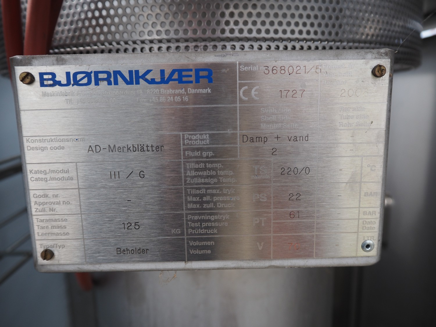 Bjørnkjær test plant for bio mass on a small laboratory scale, year of construction: 2006, serial number: 368021/5, capacity: 70 liter, maximum pressure: 22 bar, maximum temperature: 220°C, dimensions: 2500 mm x 1920 mm x 2300 mm.