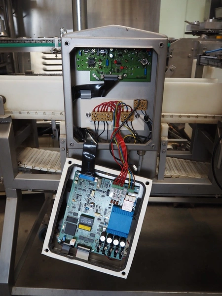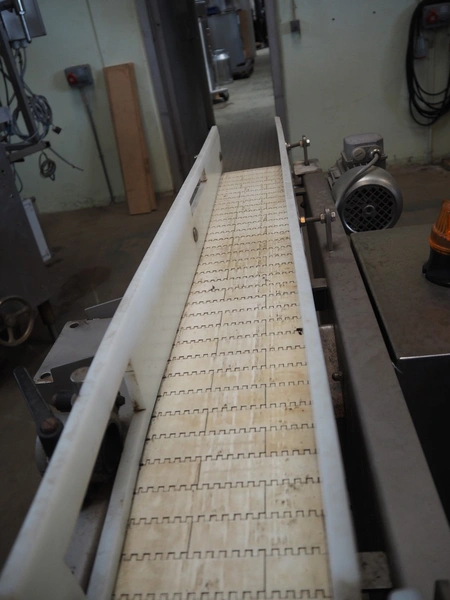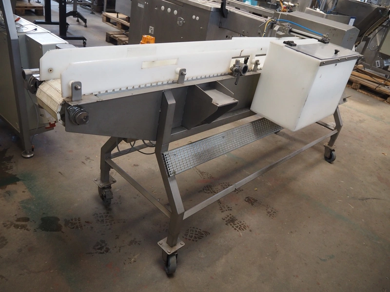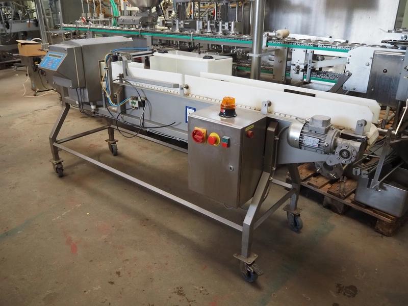 Detectronic metal detector on lamella conveyor with rejector, type: 606-250-1010-2, 220 V, clearance: 200 mm x 110 mm, plastic belt, belt width: 150 mm, total dimensions: 2600 mm x 900 mm x 1100 mm.