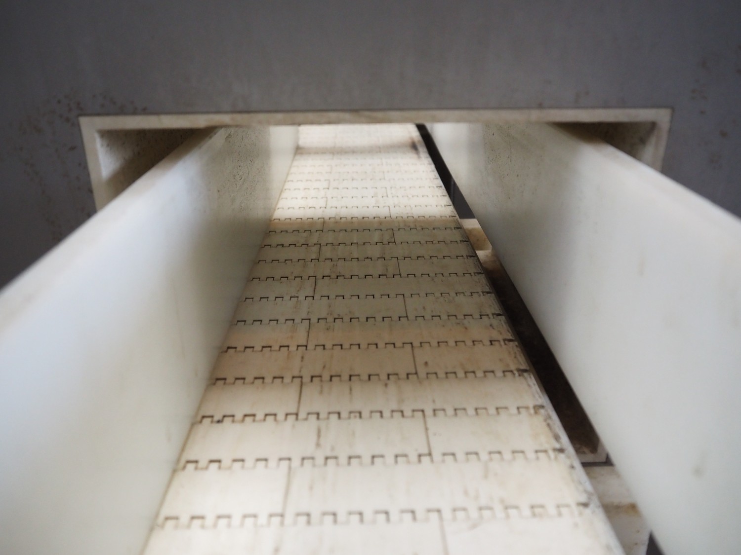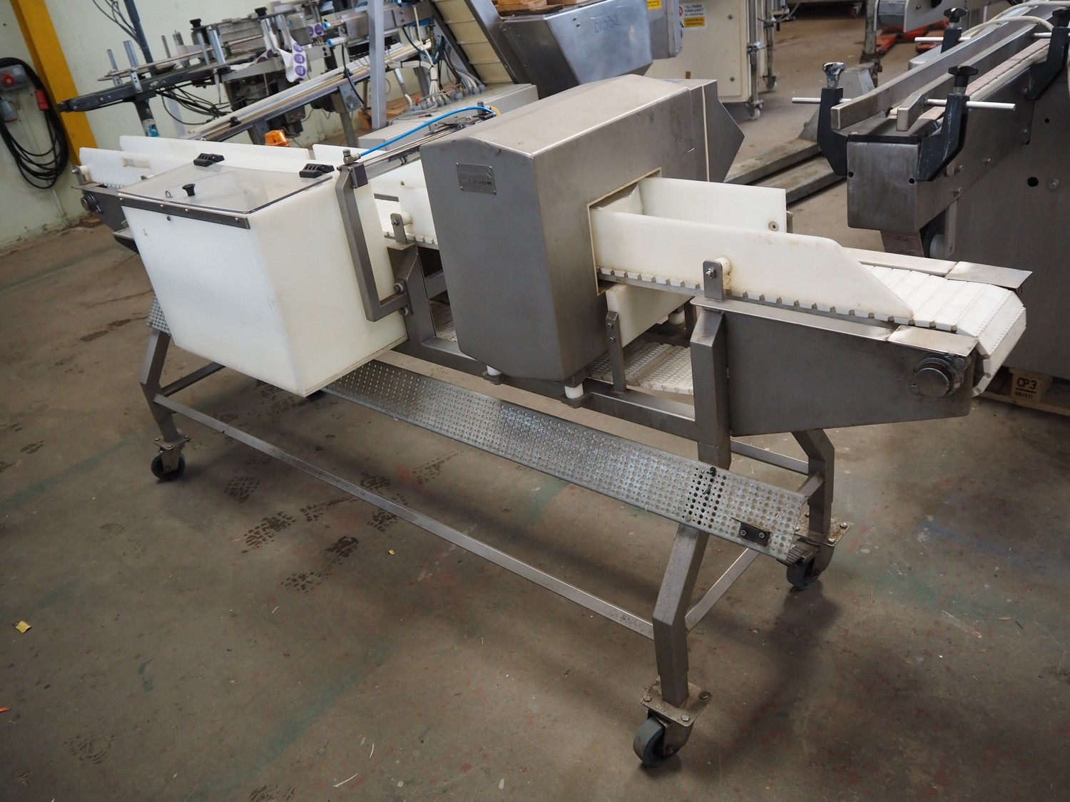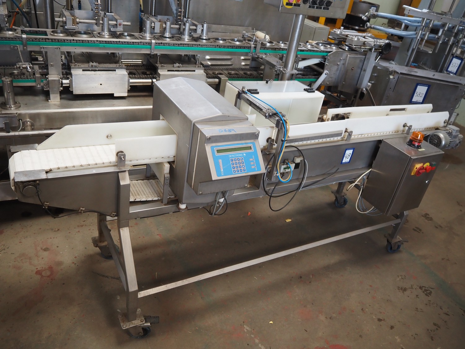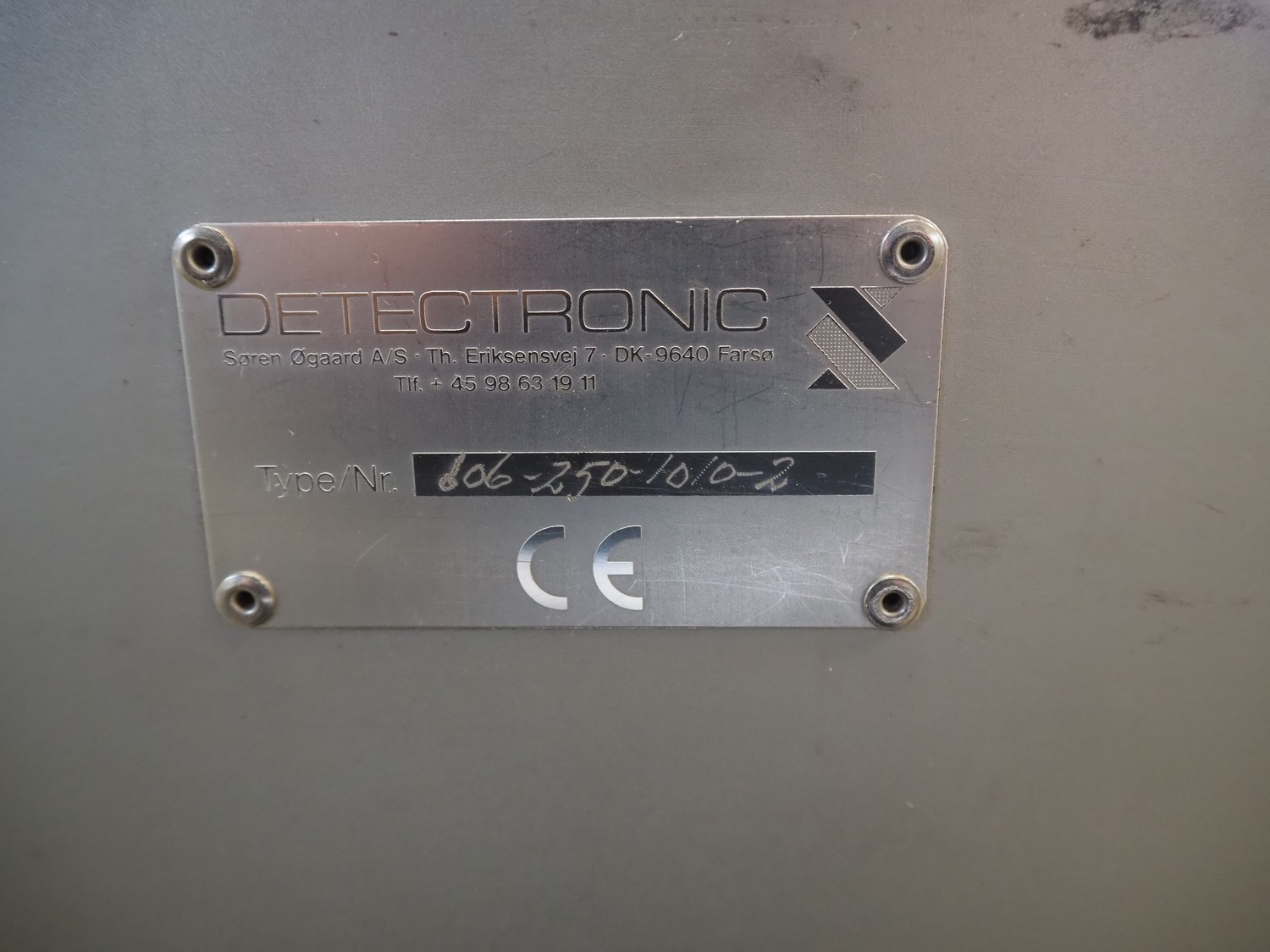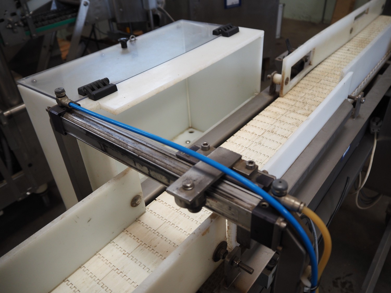 Detectronic metal detector on lamella conveyor with rejector, type: 606-250-1010-2, 220 V, clearance: 200 mm x 110 mm, plastic belt, belt width: 150 mm, total dimensions: 2600 mm x 900 mm x 1100 mm.