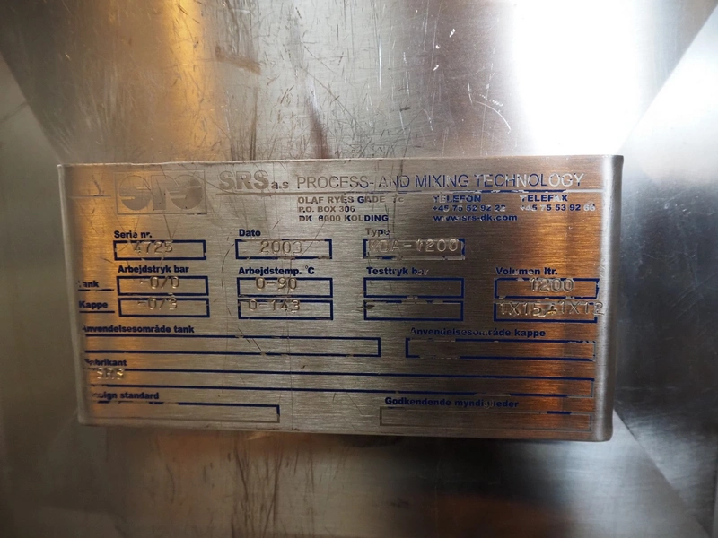 SRS a.s tiltable mixer, type: KDA-1200, serial number: 4725, year of construction: 2003, volume: 1200 liter, dimensions: 2700 mm x 1800 mm x 1700 mm. With separate electric motor.