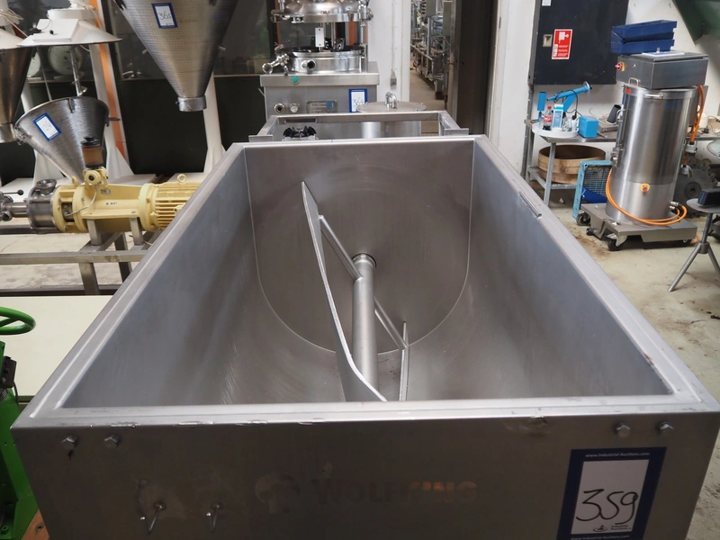 Wolfking mixer, type: SILO, number: 59107, year of construction: 1997, 380 V, 50 Hz, 5.0 A, 1.8 kW, weight: 800 kg, volume: 1500 liter, total dimensions: 2600 mm x 1200 mm x 1430 mm.