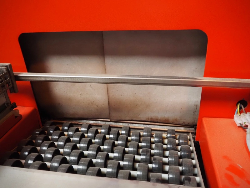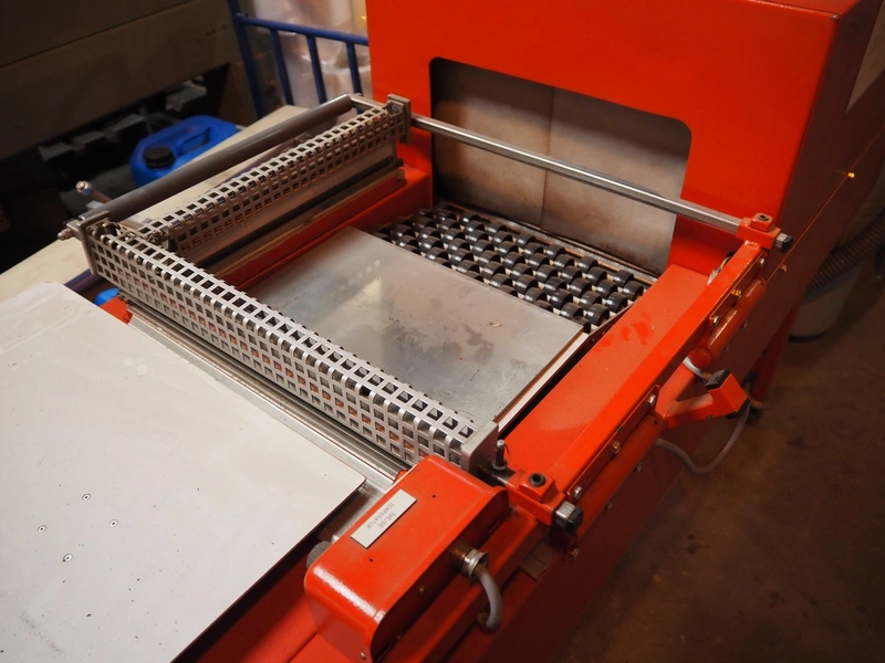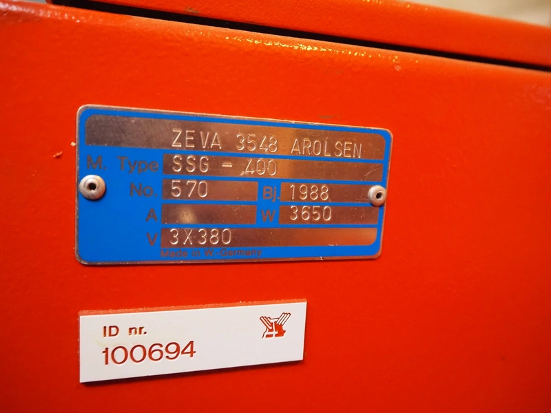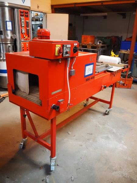 Zeva shrink packaging machine, type: SSG-400, number: 570, year of construction: 1988, 380 V, 3 Ph, 3650 W, film width: 365 mm, seal length: 400 mm and 430 mm, plastic rollers, roller width: 350 mm, clearance: 370 mm x 230 mm, total dimensions: 2100 mm x 800 mm x 1320 mm.
