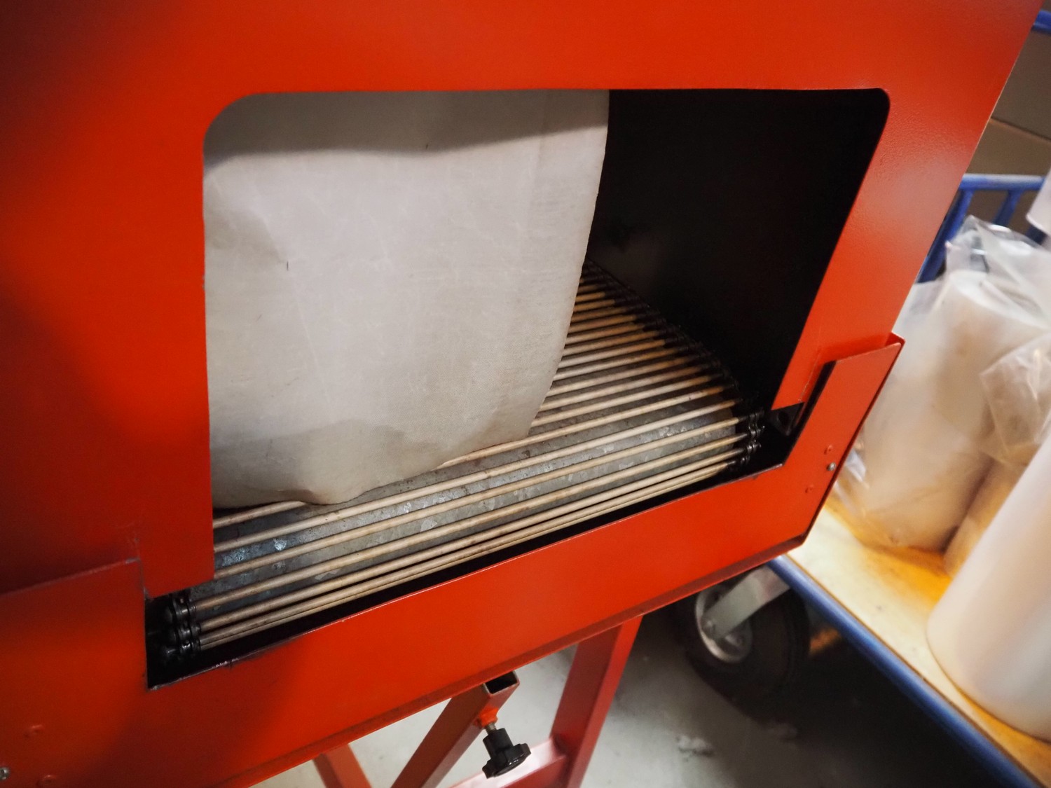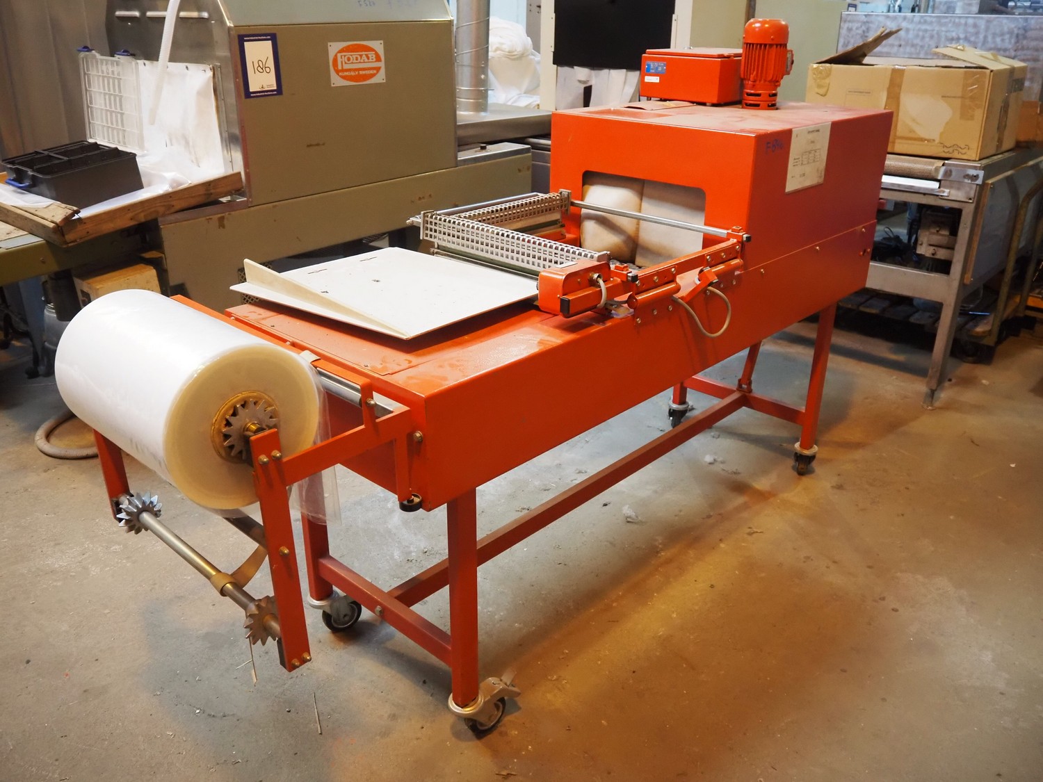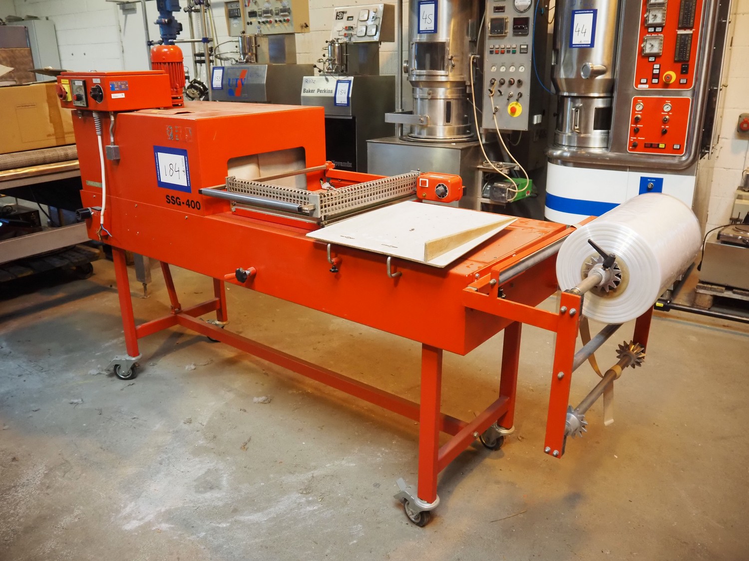 Zeva shrink packaging machine, type: SSG-400, number: 570, year of construction: 1988, 380 V, 3 Ph, 3650 W, film width: 365 mm, seal length: 400 mm and 430 mm, plastic rollers, roller width: 350 mm, clearance: 370 mm x 230 mm, total dimensions: 2100 mm x 800 mm x 1320 mm.